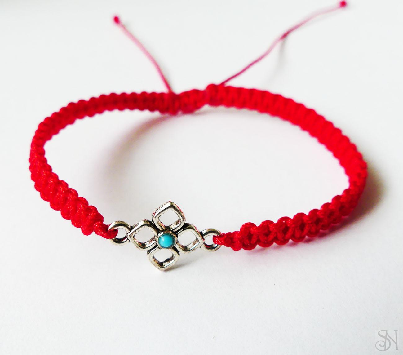 Červený náramok vyrobený zo šnúrky s kovovým príveskom bez obsahu niklu. Praktické posuvné makramé zapínanie - náramok sa roztiahne a stiahne podľa potreby.