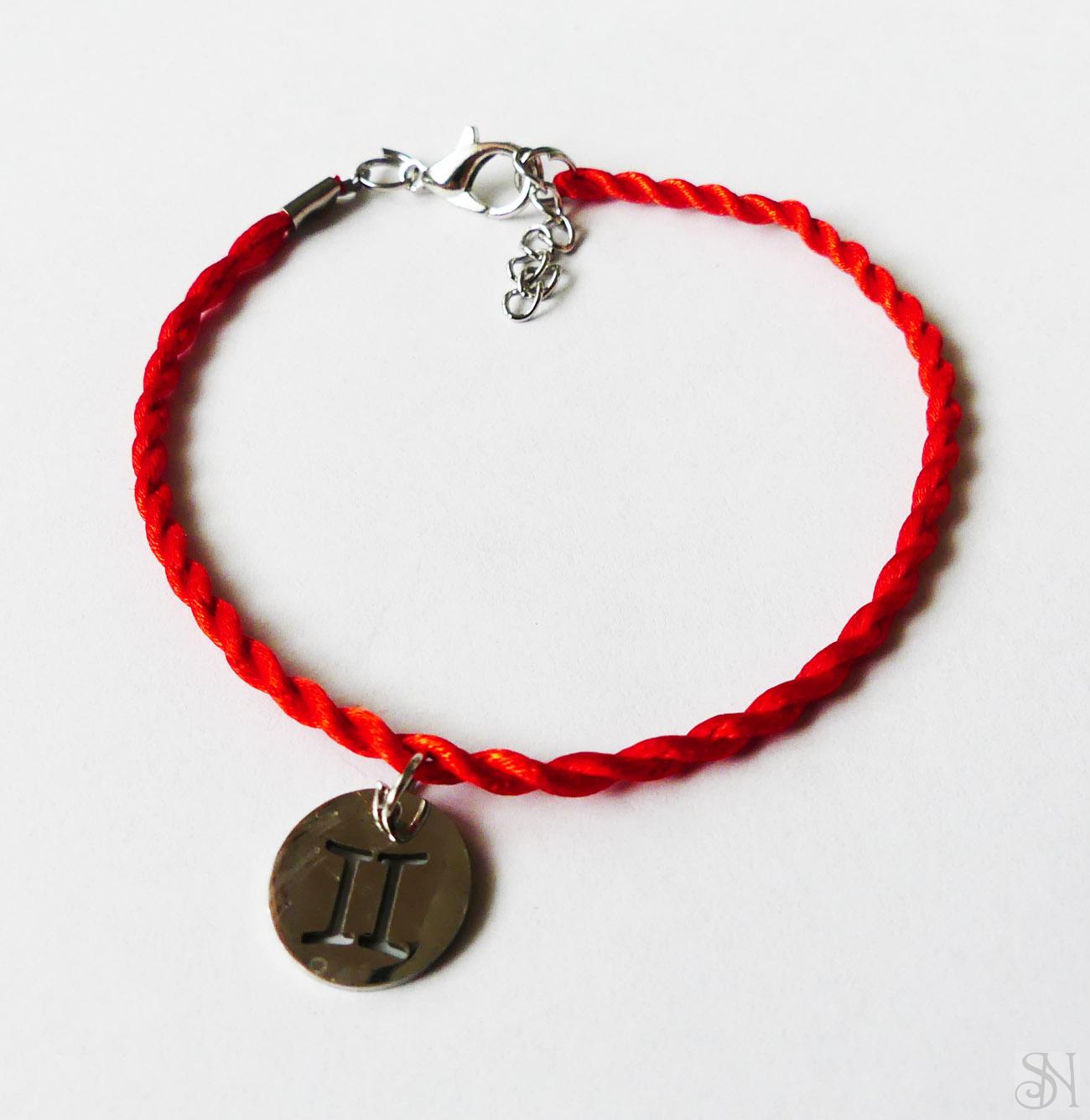 Červený náramok so znamením blížencov s komponentami z chirurgickej ocele - vhodný pre alergikov. Náramok je vyrobený zo saténovej šnúrky.