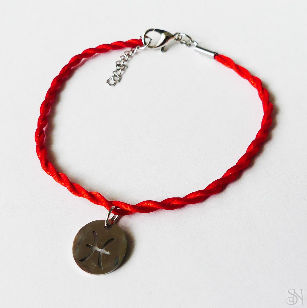Červený náramok so znamením ryby s komponentami z chirurgickej ocele - vhodný pre alergikov. Náramok je vyrobený zo saténovej šnúrky.