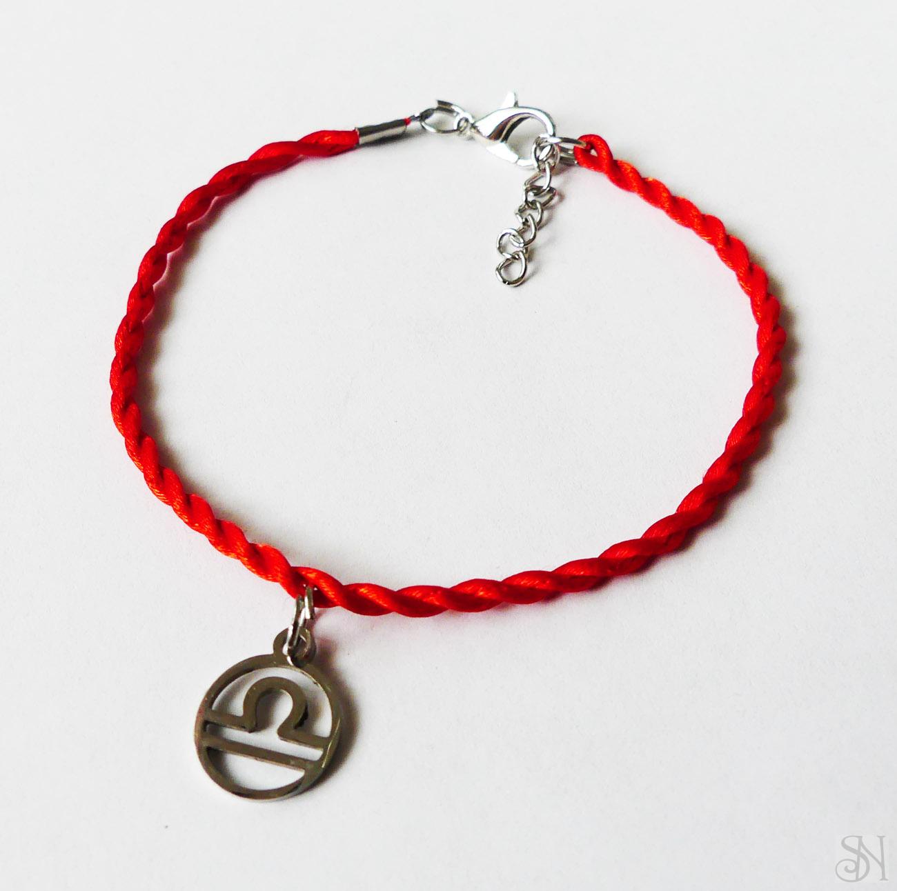 Červený náramok so znamením váhy s komponentami z chirurgickej ocele - vhodný pre alergikov. Náramok je vyrobený zo saténovej šnúrky.