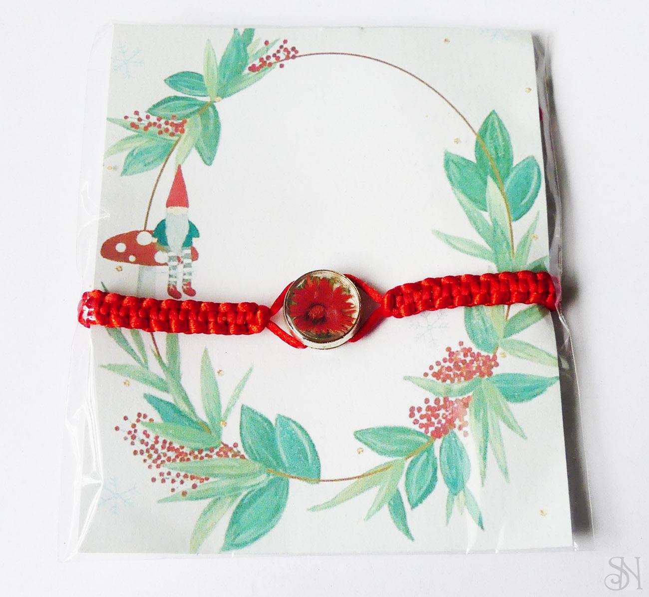 Červený náramok vyrobený zo šnúrky s príveskom kvetu na darčekovej kartičke. Praktické posuvné makramé zapínanie - náramok sa roztiahne a stiahne podľa potreby.