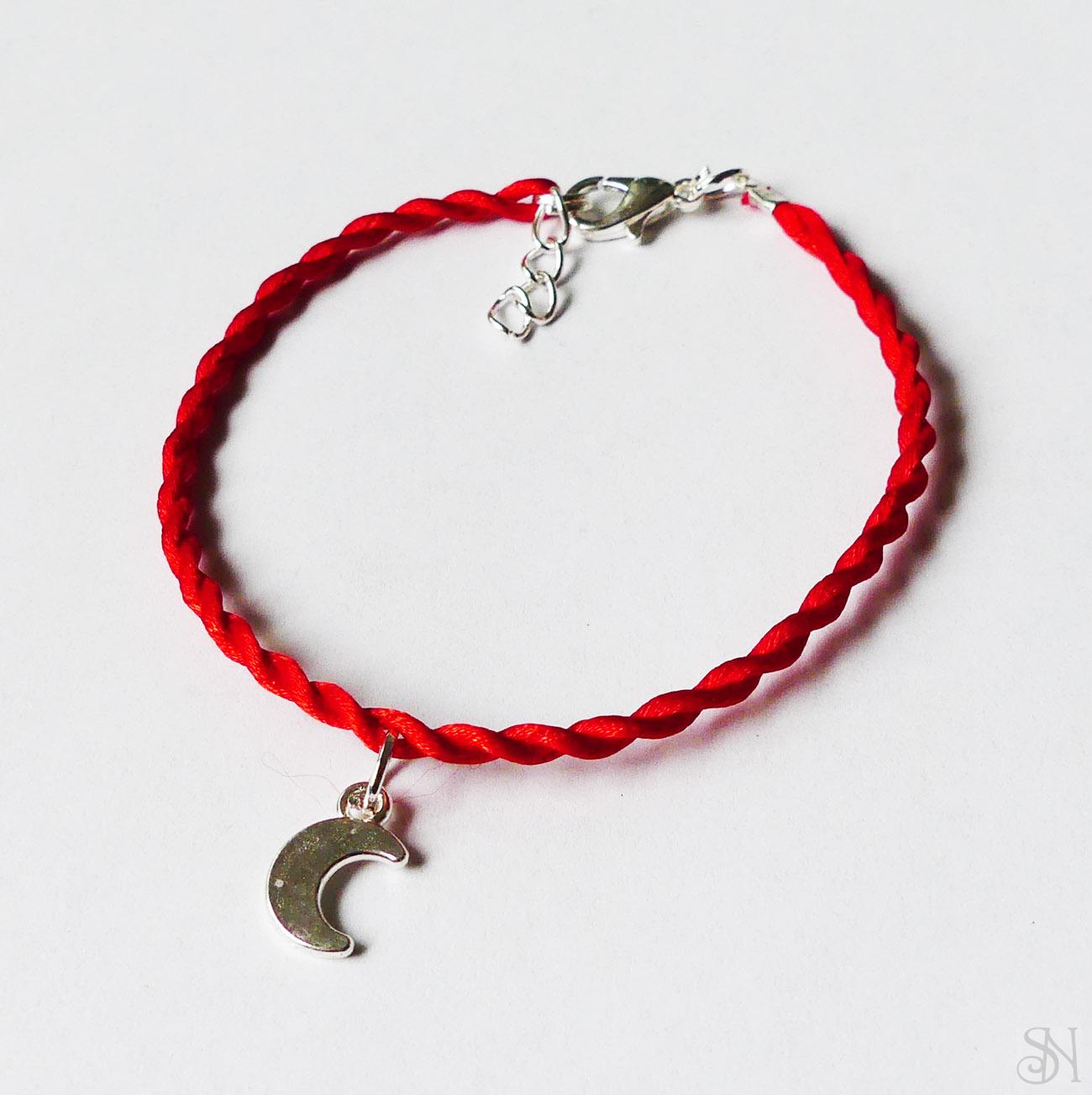 Červený ochranný náramok s príveskom mesiaca. Náramok je vyrobený zo saténovej šnúrky. Doplnený je postriebrenými kovovými komponentami bez obsahu niklu.