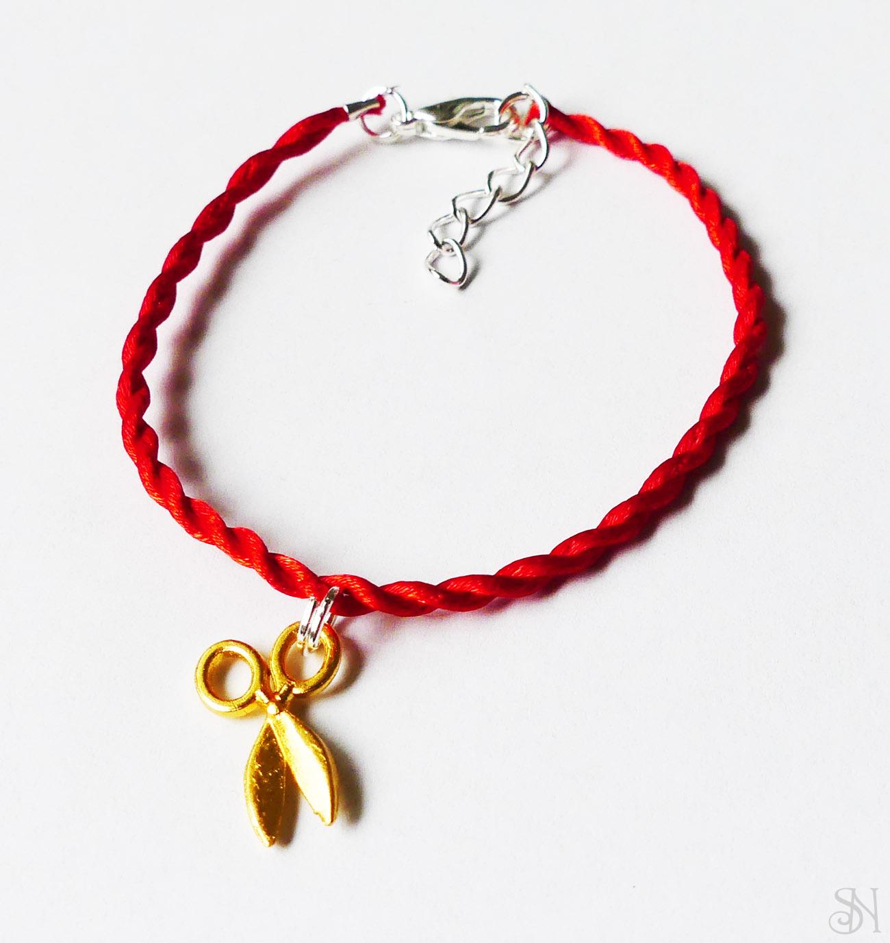 Červený ochranný náramok s príveskom nožníc. Náramok je vyrobený zo saténovej šnúrky. Doplnený je postriebrenými kovovými komponentami bez obsahu niklu.
