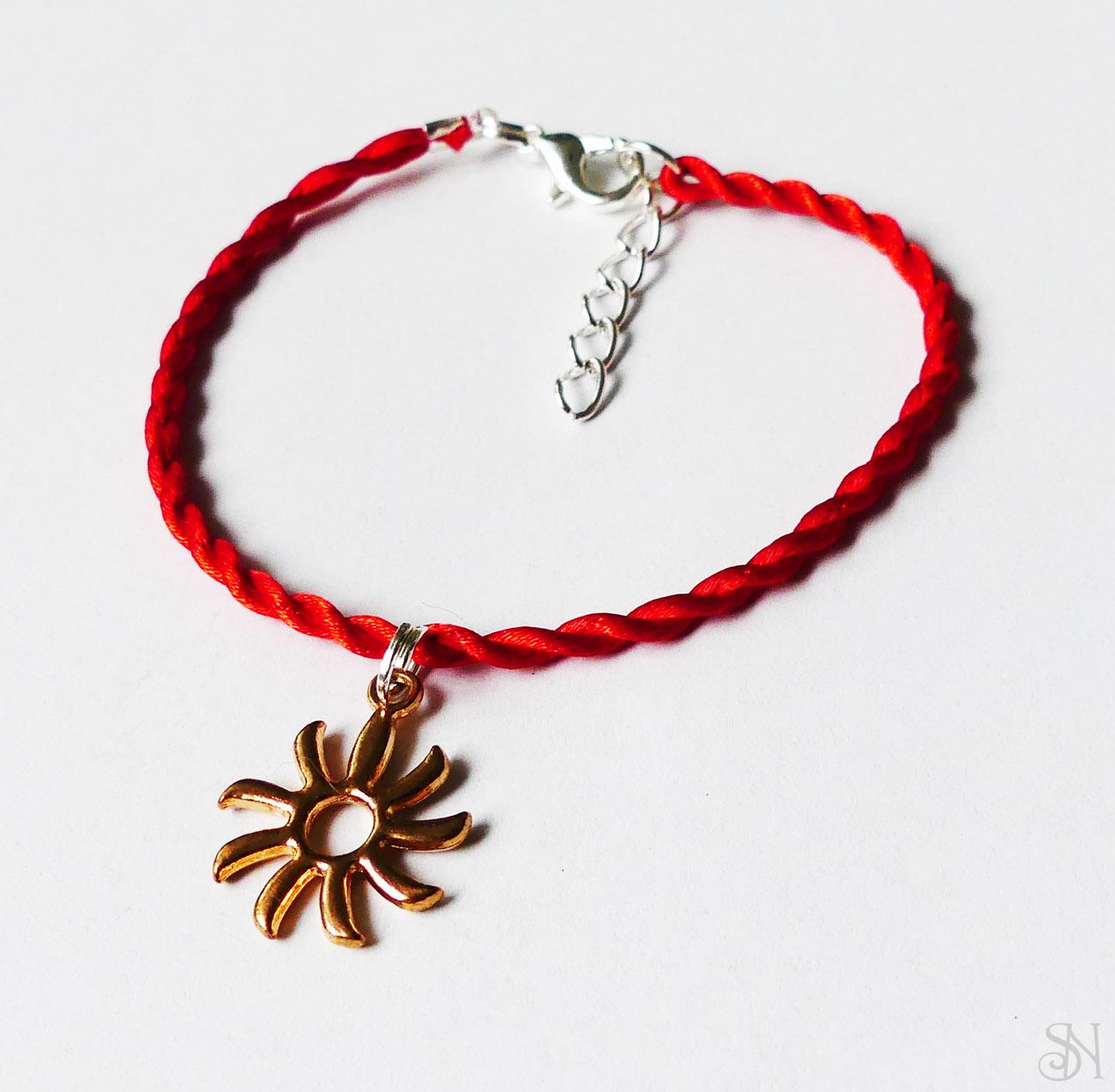 Červený ochranný náramok s príveskom slnka. Náramok je vyrobený zo saténovej šnúrky. Doplnený je postriebrenými kovovými komponentami bez obsahu niklu.