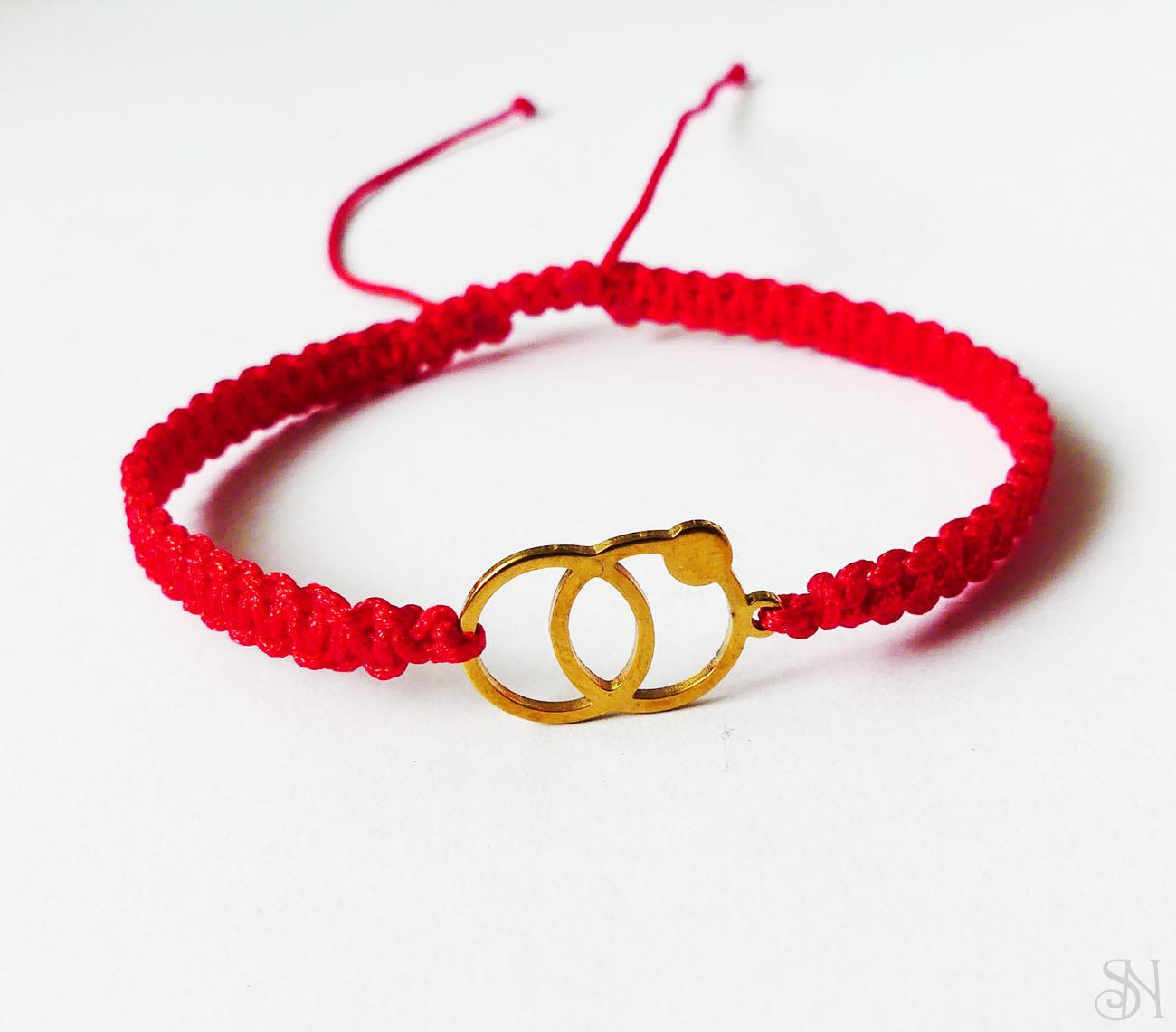 Červený pletený náramok vyrobený zo šnúrky a kovového komponentu z chirurgickej ocele. Praktické posuvné makramé zapínanie - náramok sa roztiahne a stiahne podľa potreby.