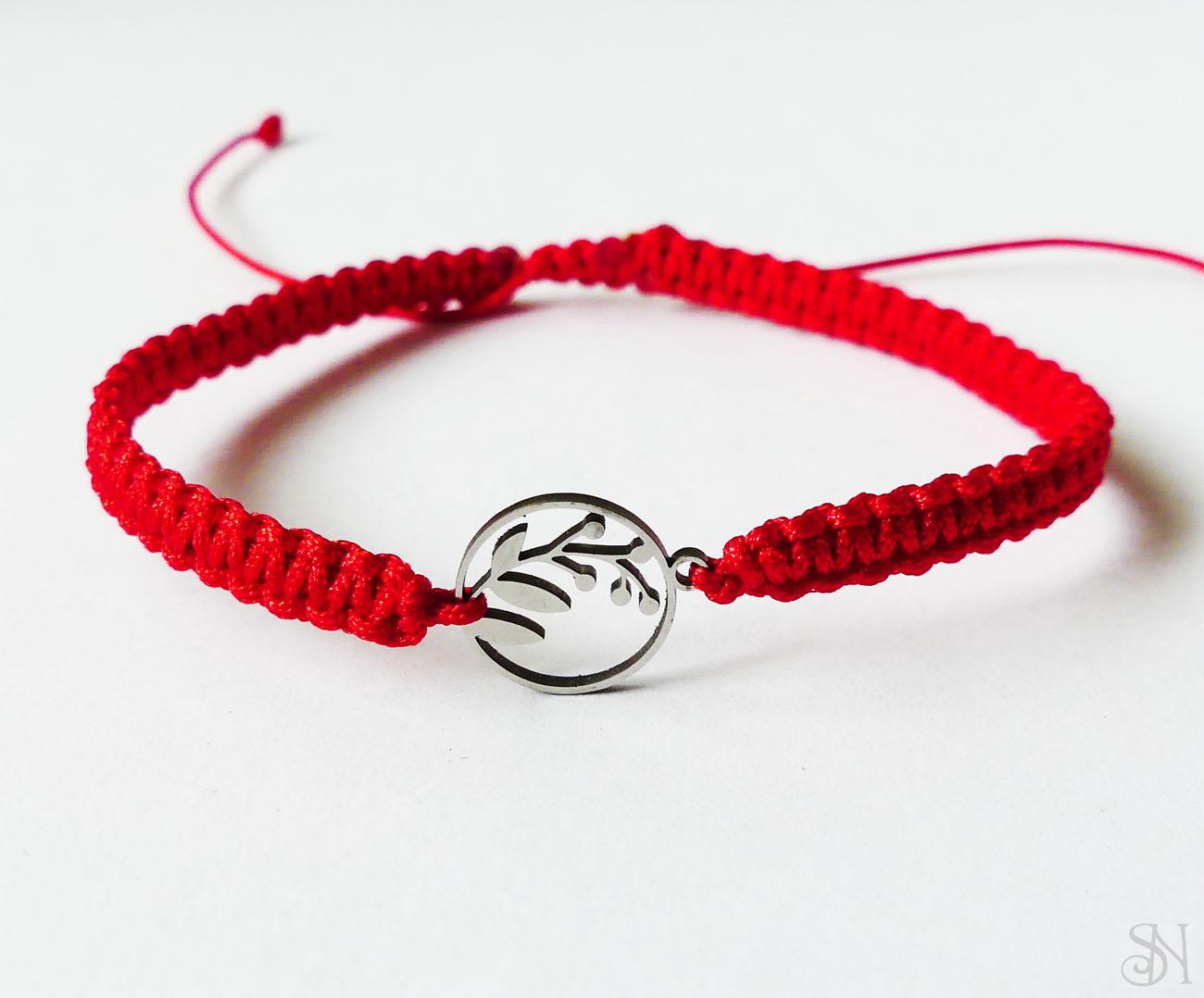 Červený pletený náramok vyrobený zo šnúrky a kovového komponentu z chirurgickej ocele. Praktické posuvné makramé zapínanie - náramok sa roztiahne a stiahne podľa potreby.