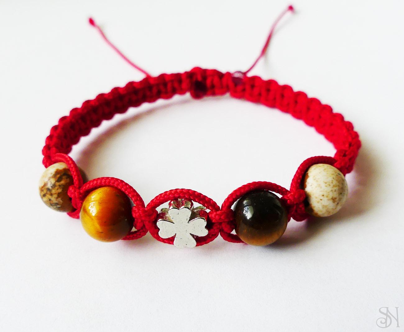 Červený pletený náramok vyrobený zo šnúrky s liečivými kameňmi tigrím okom a jaspisom pieskovým. V strede je kovová korálka štvorlístka. Praktické posuvné makramé zapínanie - náramok sa roztiahne a stiahne podľa potreby.