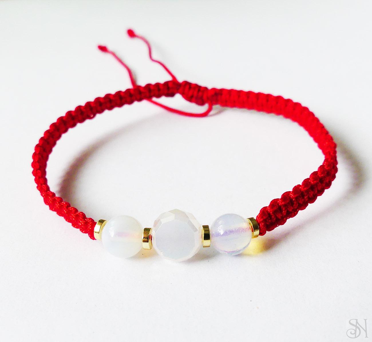 Červený pletený náramok vyrobený zo šnúrky a sklenenej korálky s liečivými kameňmi hematitom a opalitom. Praktické posuvné makramé zapínanie - náramok sa roztiahne a stiahne podľa potreby.