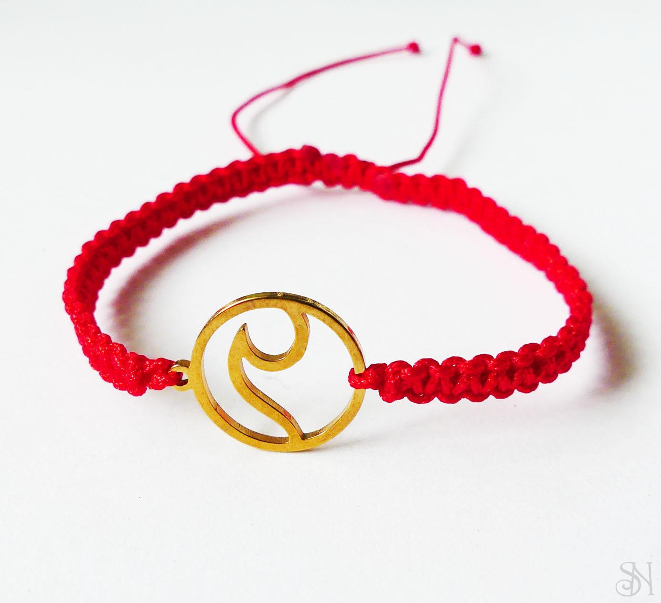 Červený pletený náramok vyrobený zo šnúrky a kovového komponentu z chirurgickej ocele. Praktické posuvné makramé zapínanie - náramok sa roztiahne a stiahne podľa potreby.
