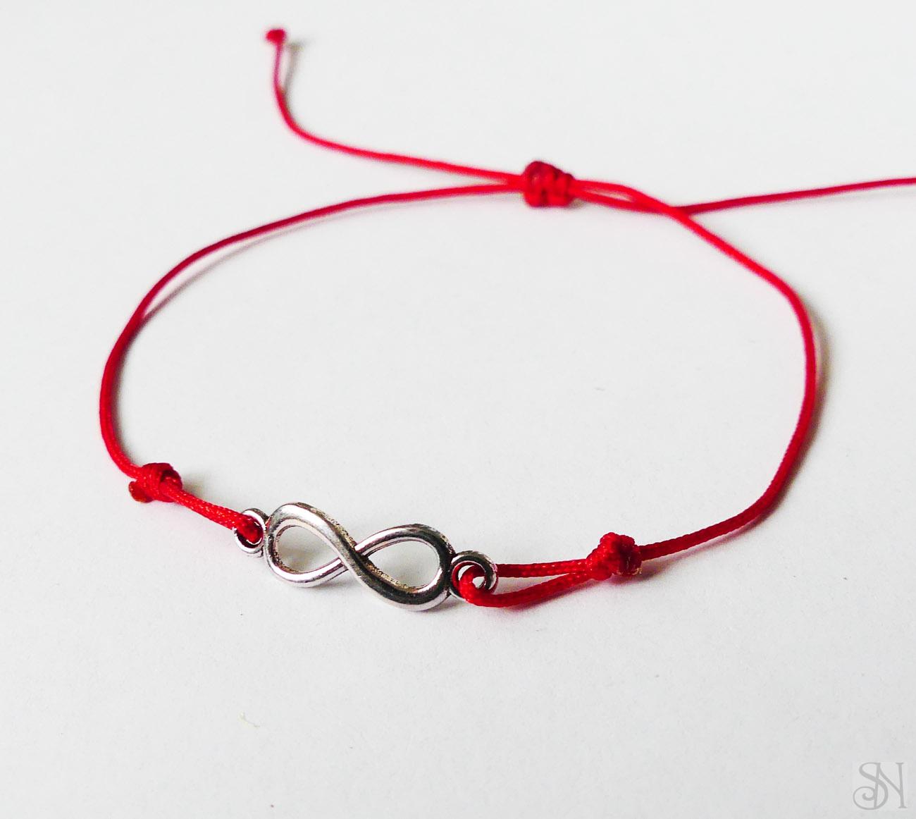 Červený zaťahovací šnúrkový náramok s nekonečnom z bižutérneho kovu bez obsahu niklu.