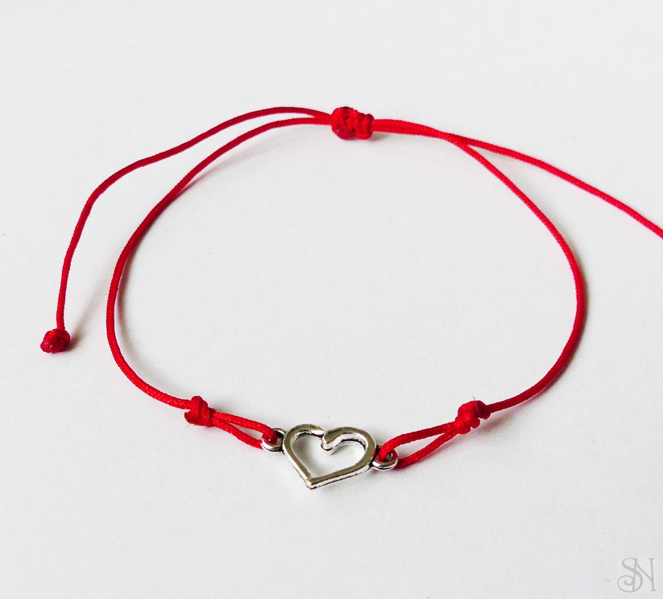 Červený zaťahovací šnúrkový náramok so srdiečkom z bižutérneho kovu bez obsahu niklu.