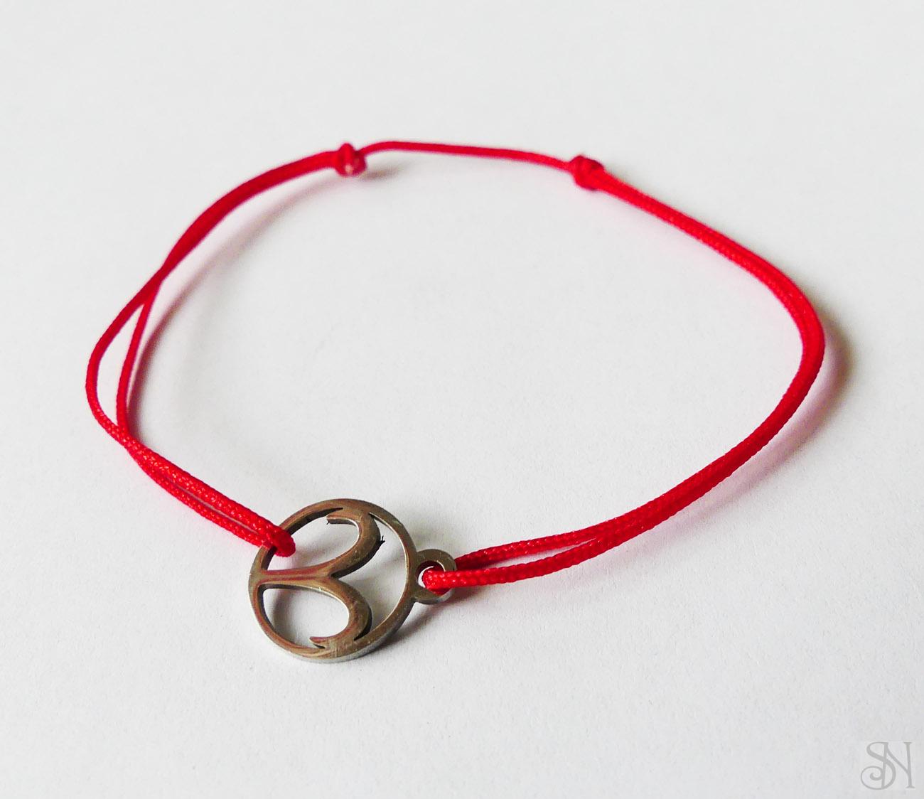 Červený náramok so znamením baran s komponentom z chirurgickej ocele - vhodný pre alergikov. Náramok sa zaťahuje chytením jedného uzlíka a ťahaním protiľahlej šnúrky.