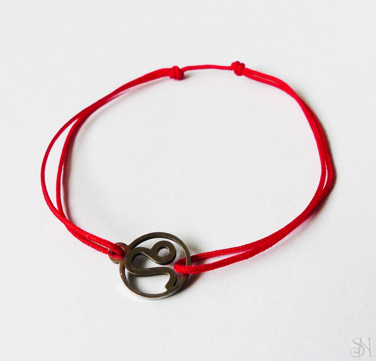 Červený náramok so znamením leva s komponentom z chirurgickej ocele - vhodný pre alergikov. Náramok sa zaťahuje chytením jedného uzlíka a ťahaním protiľahlej šnúrky.