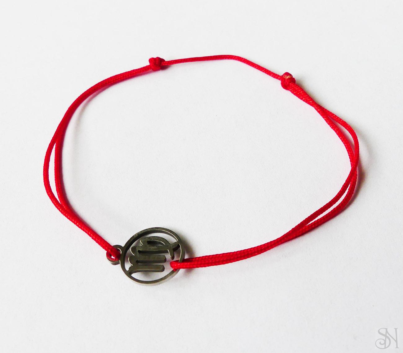 Červený náramok so znamením panny s komponentom z chirurgickej ocele - vhodný pre alergikov. Náramok sa zaťahuje chytením jedného uzlíka a ťahaním protiľahlej šnúrky.