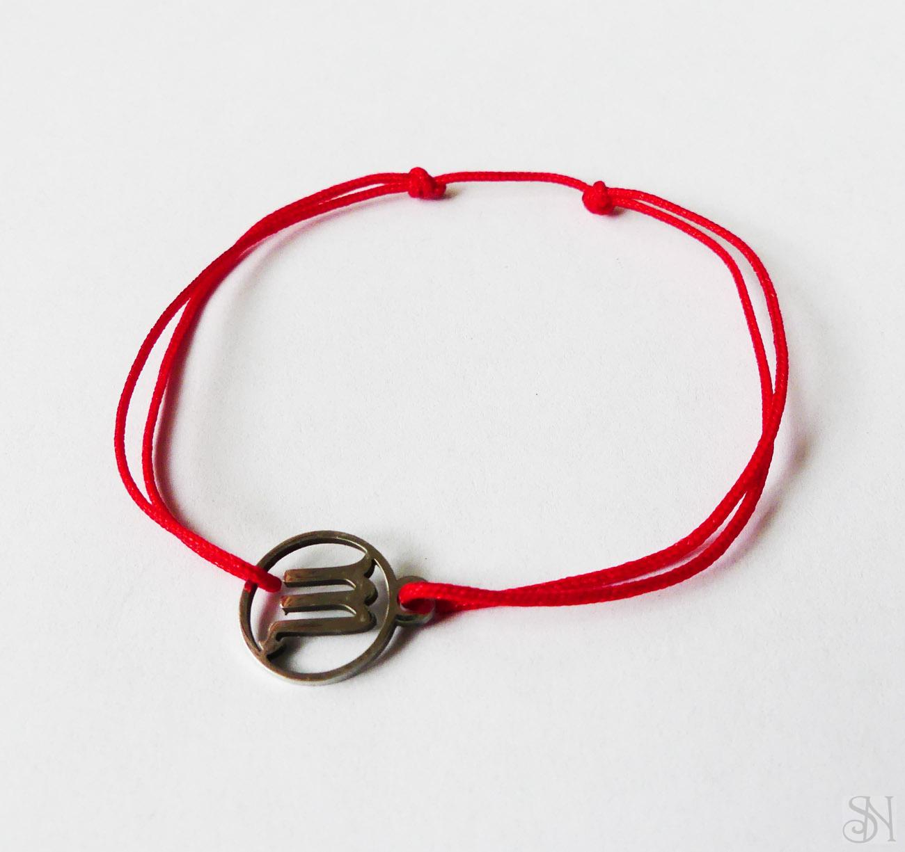 Červený náramok so znamením škorpióna s komponentom z chirurgickej ocele - vhodný pre alergikov. Náramok sa zaťahuje chytením jedného uzlíka a ťahaním protiľahlej šnúrky.