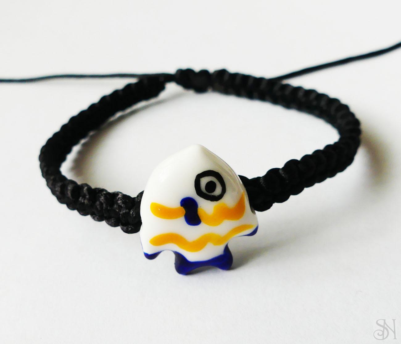 Čierny náramok vyrobený zo šnúrky s korálkou. Praktické posuvné makramé zapínanie - náramok sa roztiahne a stiahne podľa potreby.
