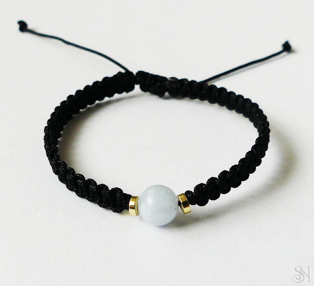 Čierny pletený náramok vyrobený zo šnúrky s liečivými kameňmi hematitom a akvamarínom. Praktické posuvné makramé zapínanie - náramok sa roztiahne a stiahne podľa potreby.