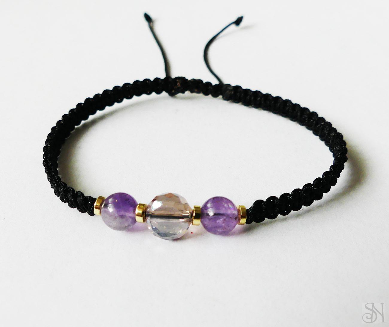 Čierny pletený náramok vyrobený zo šnúrky a sklenenej korálky s liečivými kameňmi hematitom a ametystom. Praktické posuvné makramé zapínanie - náramok sa roztiahne a stiahne podľa potreby.