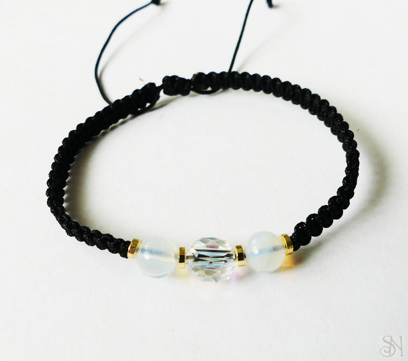 Čierny pletený náramok vyrobený zo šnúrky a sklenenej korálky s liečivými kameňmi hematitom a opalitom. Praktické posuvné makramé zapínanie - náramok sa roztiahne a stiahne podľa potreby.
