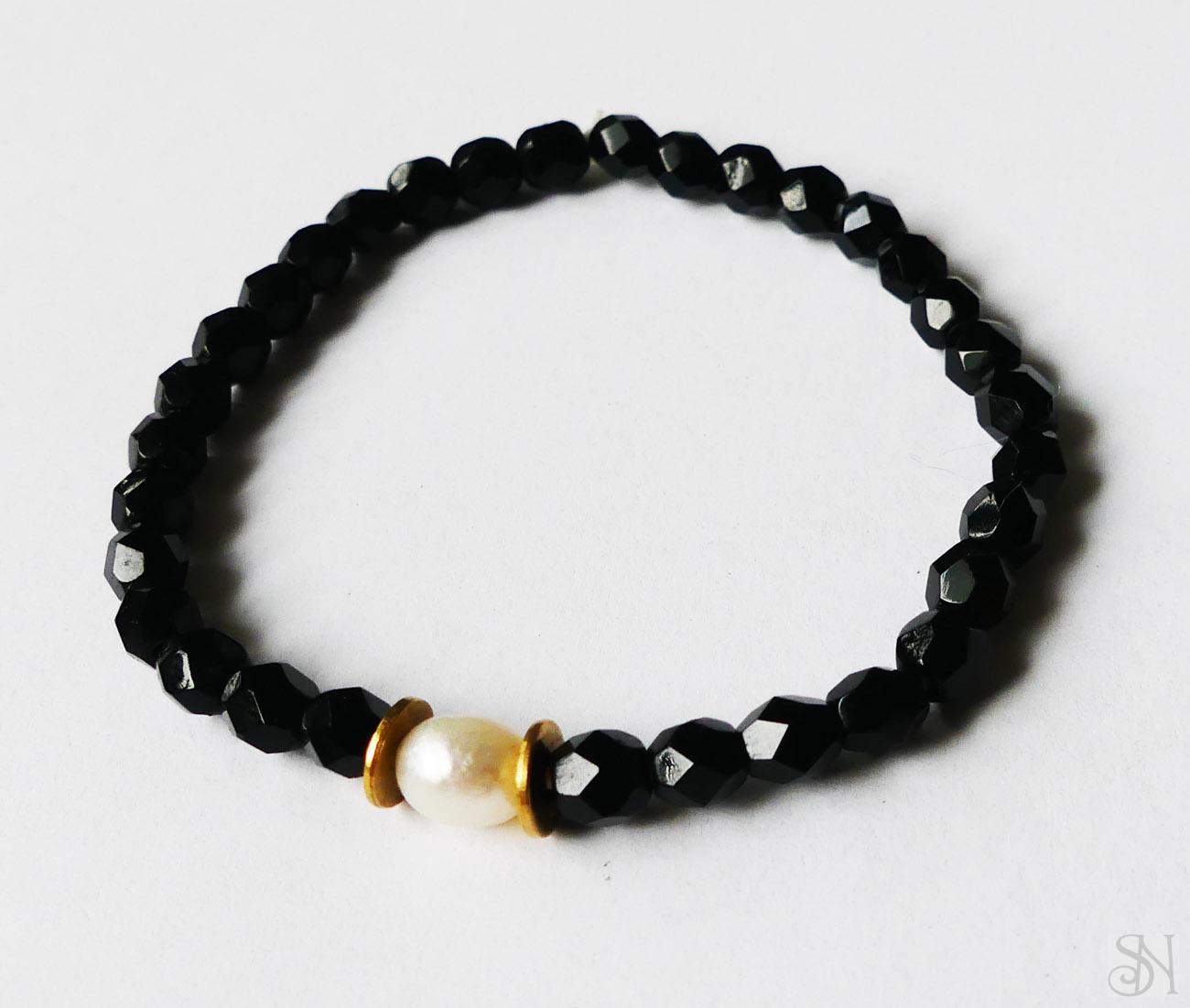 Handmade čierny náramok na gumičke zo sklenených korálok, kovových komponentov bez obsahu niklu a riečnej perly.
