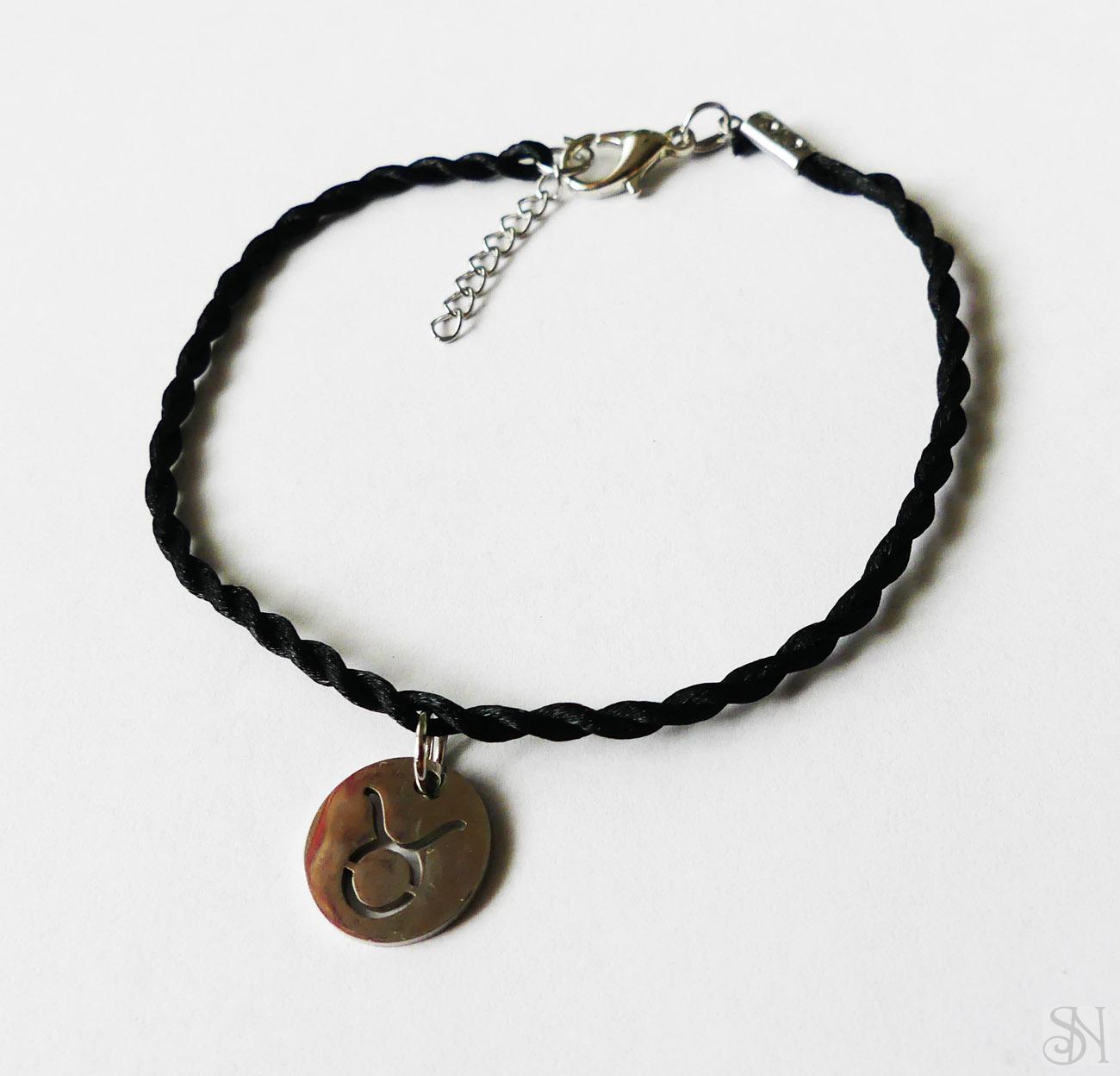 Čierny náramok so znamením býka s komponentami z chirurgickej ocele - vhodný pre alergikov. Náramok je vyrobený zo saténovej šnúrky.