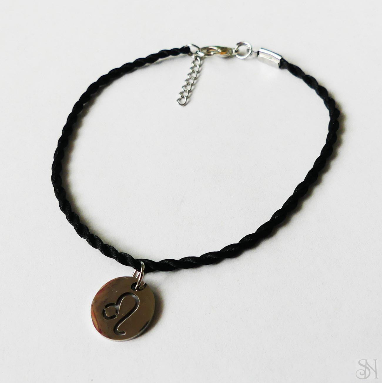 Čierny náramok so znamením leva s komponentami z chirurgickej ocele - vhodný pre alergikov. Náramok je vyrobený zo saténovej šnúrky.
