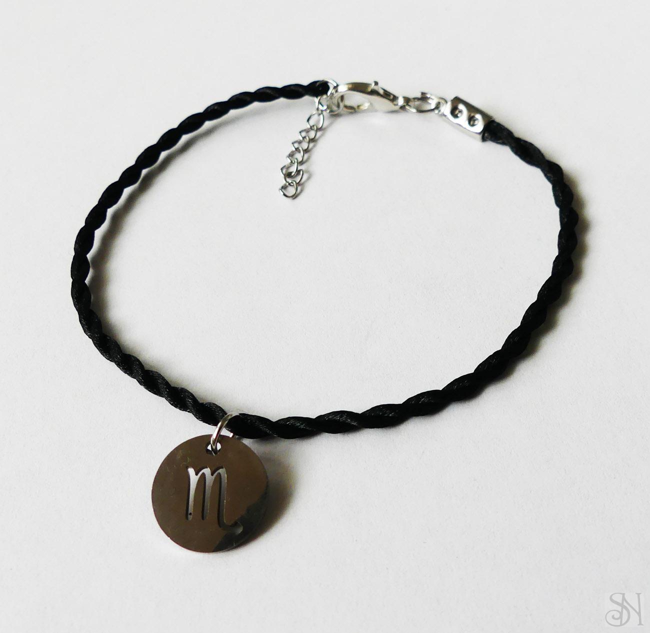Čierny náramok so znamením škorpióna s komponentami z chirurgickej ocele - vhodný pre alergikov. Náramok je vyrobený zo saténovej šnúrky.