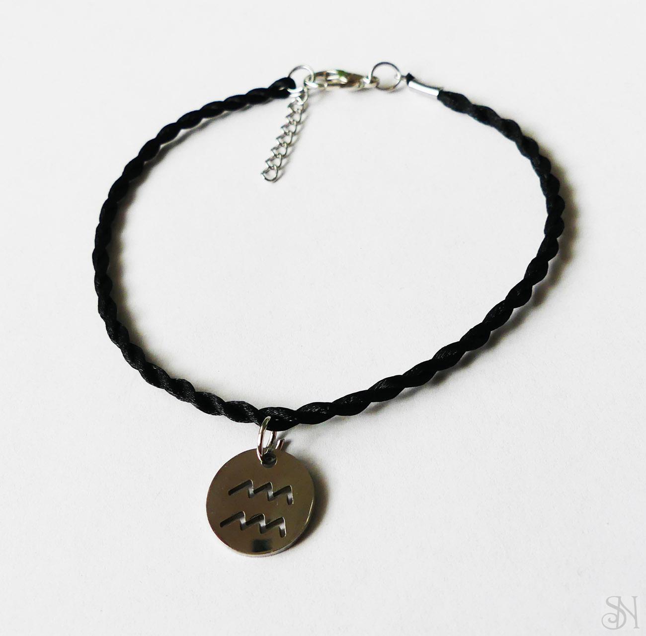 Čierny náramok so znamením vodnára s komponentami z chirurgickej ocele - vhodný pre alergikov. Náramok je vyrobený zo saténovej šnúrky.