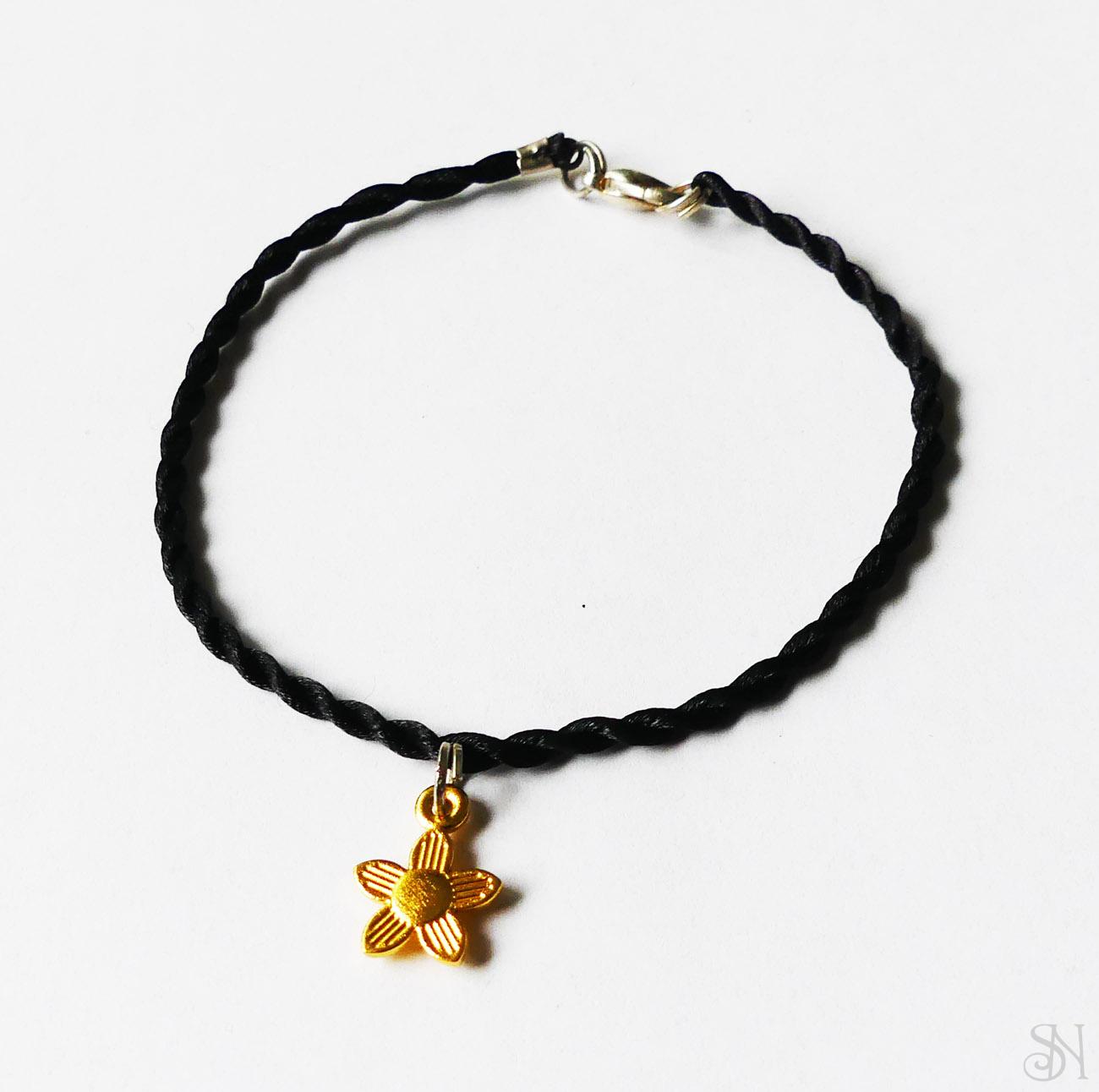 Čierny náramok s príveskom kvetu. Náramok je vyrobený zo saténovej šnúrky. Doplnený je postriebrenými kovovými komponentami bez obsahu niklu.