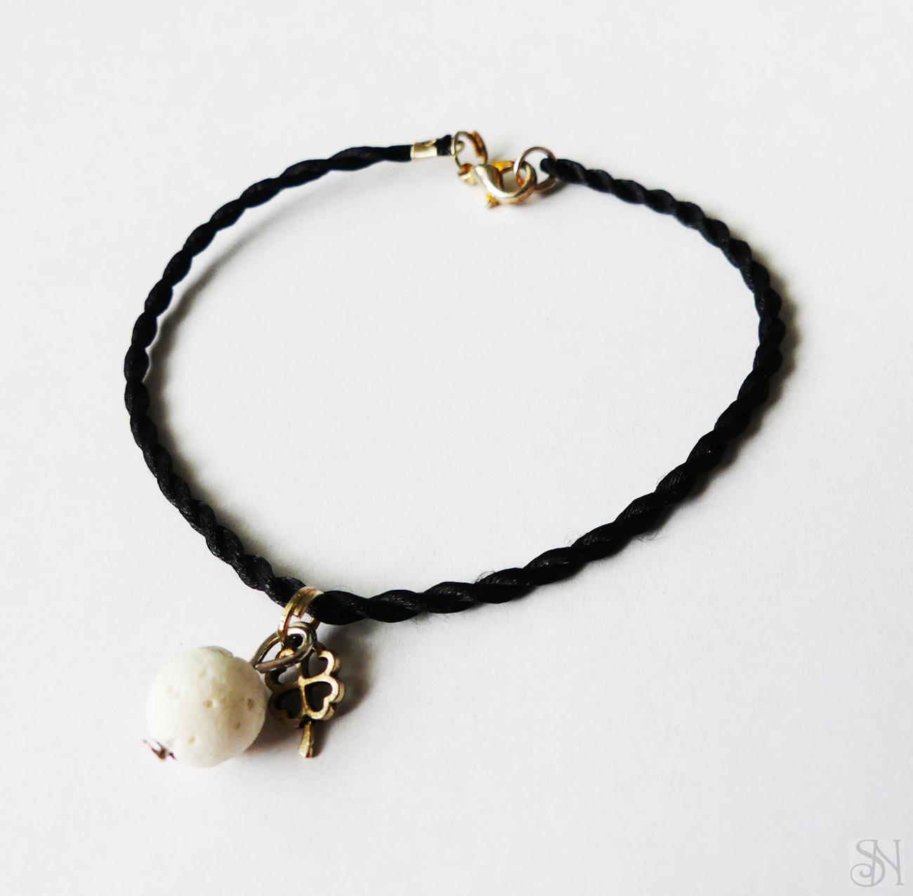 Čierny náramok s lávovým kameňom a príveskom štvorlístka. Náramok je vyrobený zo saténovej šnúrky. Doplnený je postriebrenými kovovými komponentami bez obsahu niklu.