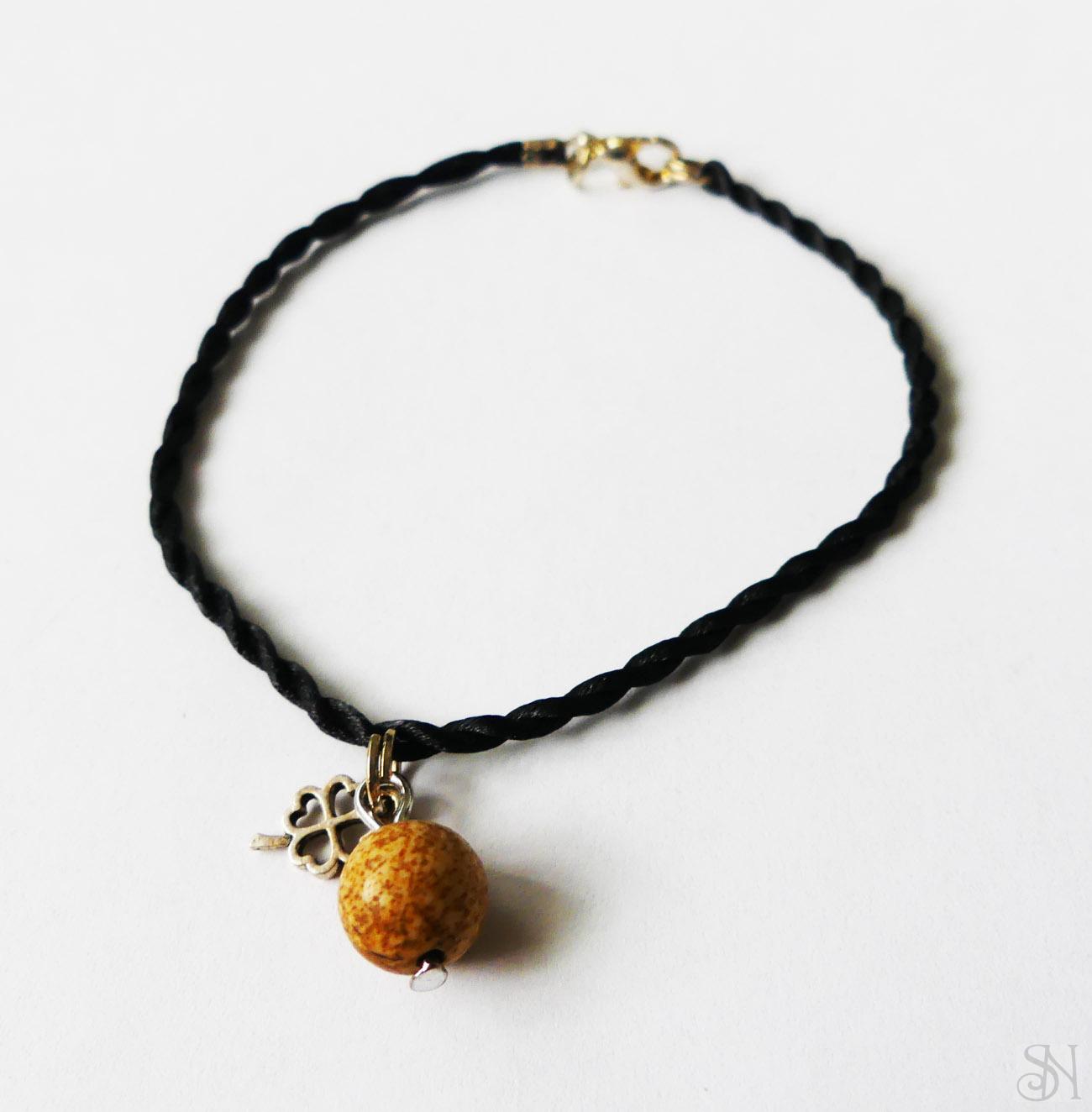 Čierny náramok s liečivým kameňom jaspisom pieskovým a príveskom štvorlístka. Náramok je vyrobený zo saténovej šnúrky. Doplnený je postriebrenými kovovými komponentami bez obsahu niklu.