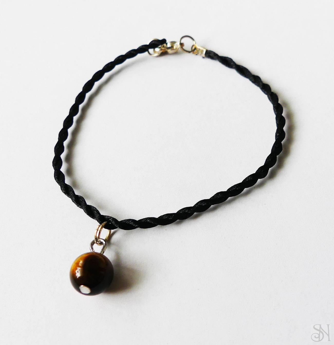 Čierny náramok s liečivým kameňom tigrím okom. Náramok je vyrobený zo saténovej šnúrky. Doplnený je postriebrenými kovovými komponentami bez obsahu niklu.