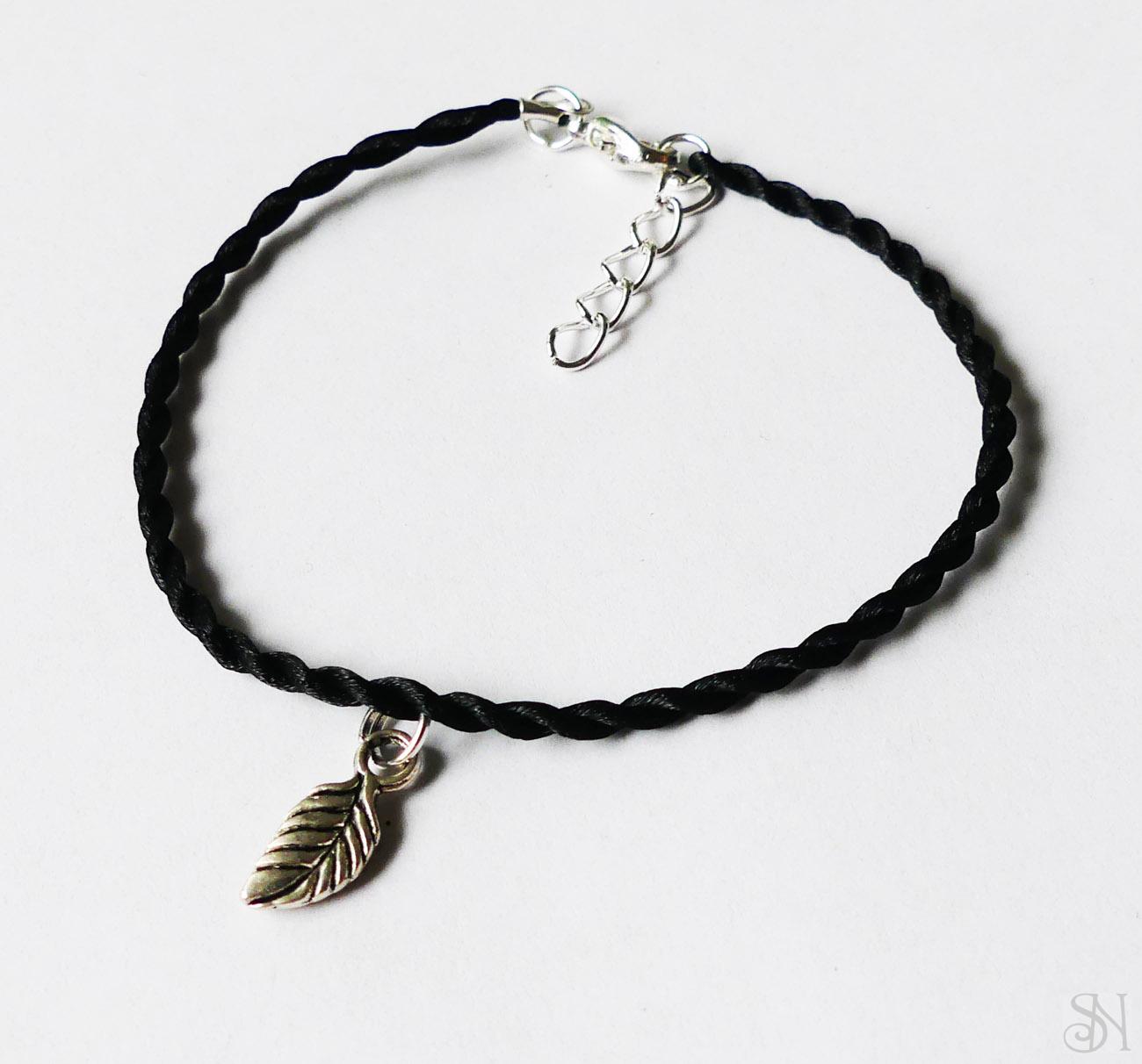 Čierny náramok s príveskom listu. Náramok je vyrobený zo saténovej šnúrky. Doplnený je postriebrenými kovovými komponentami bez obsahu niklu.