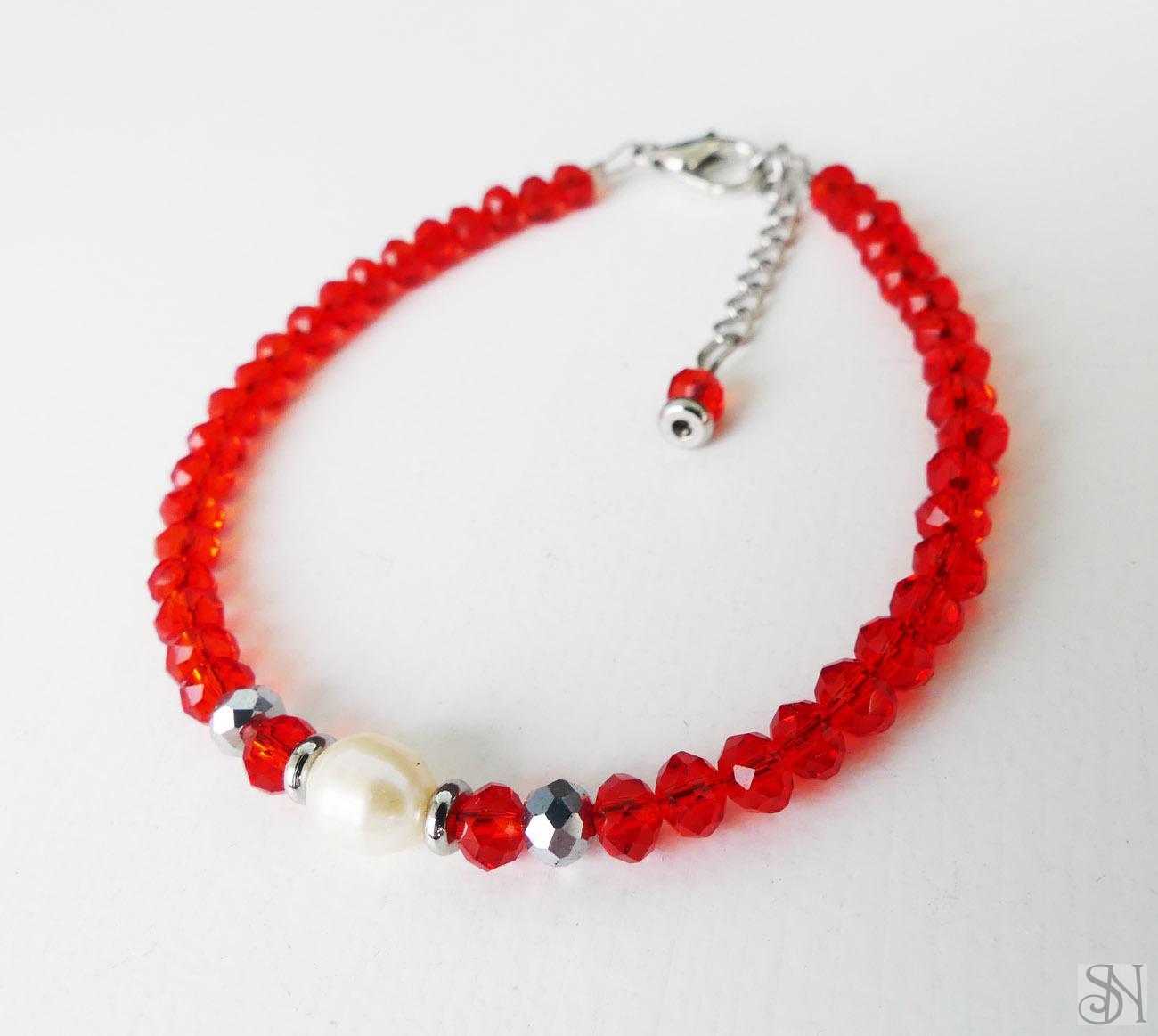 Červený náramok s riečnou perlou. Doplnený je sklenenými korálkami. Kovové komponenty sú z chirurgickej ocele.