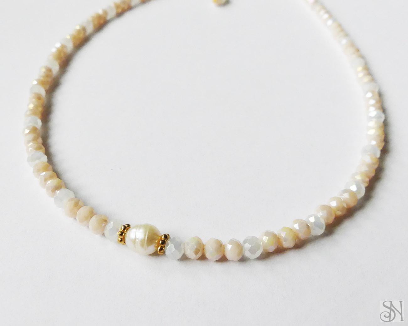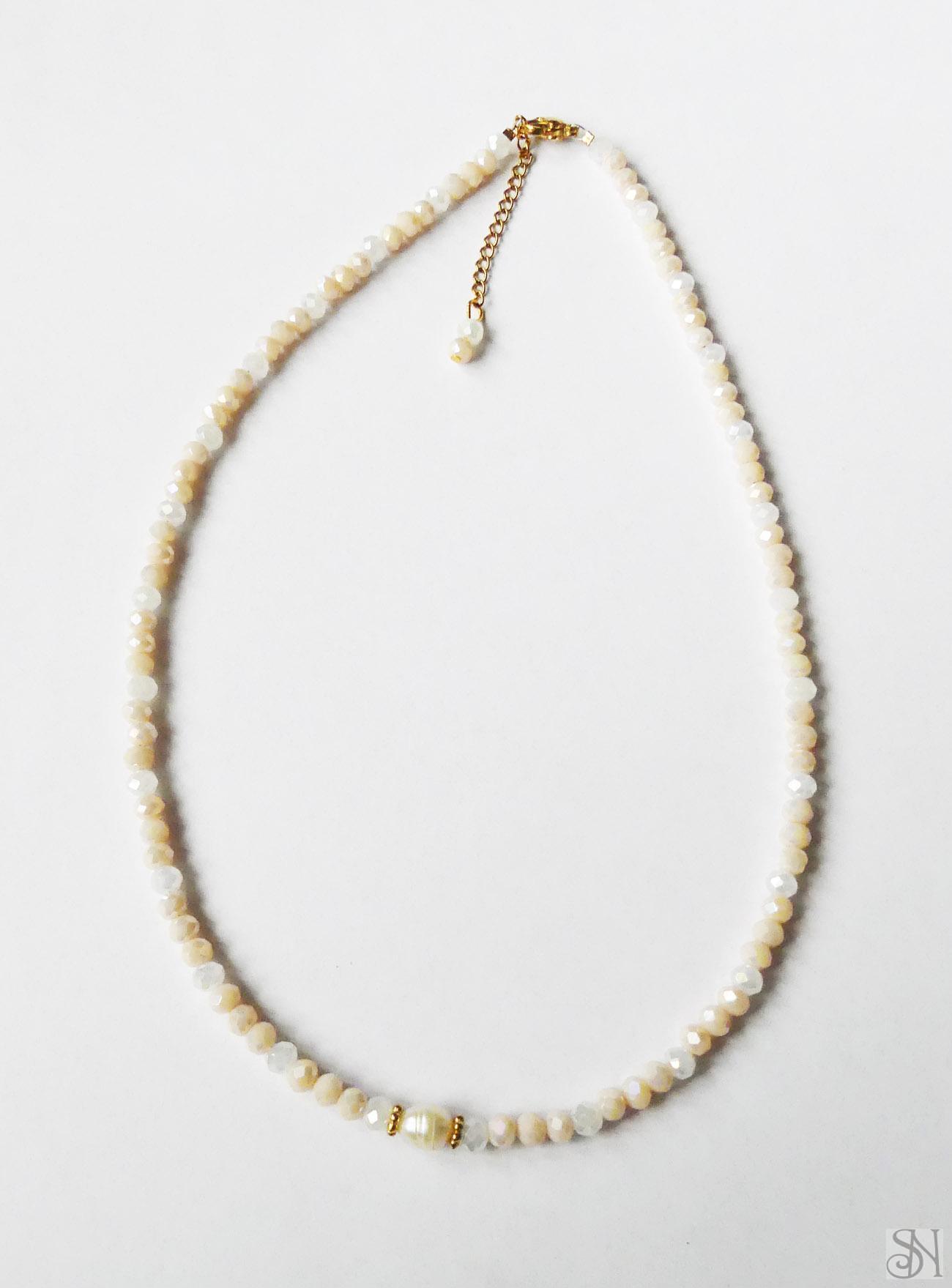 Handmade zapínací náhrdelník s riečnou perlou. Kvalitné sklenené korálky sú navliekané na oceľovom lanku. Kovové komponenty sú z chirurgickej ocele zlatej farby. Zapínanie je na karabínku.