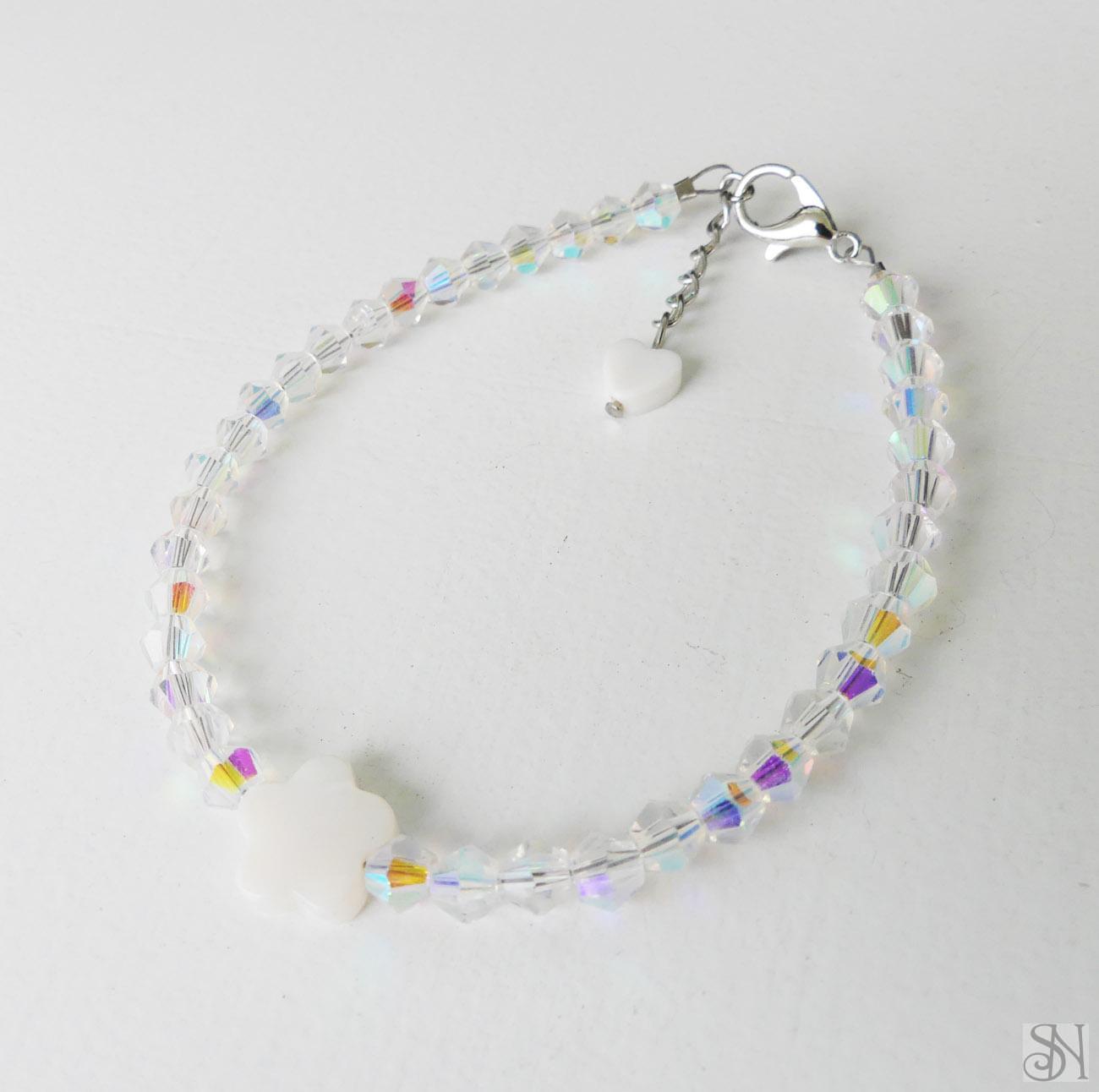 Náramok s AB leskom s perleťovou korálkou. Doplnený je sklenenými korálkami. Kovové komponenty sú z chirurgickej ocele.