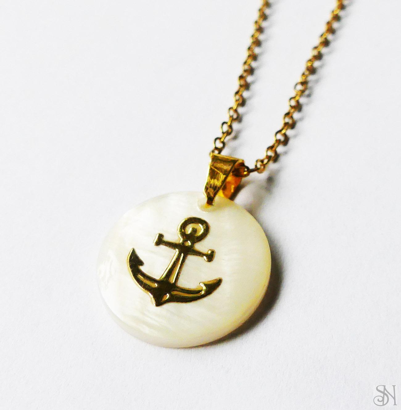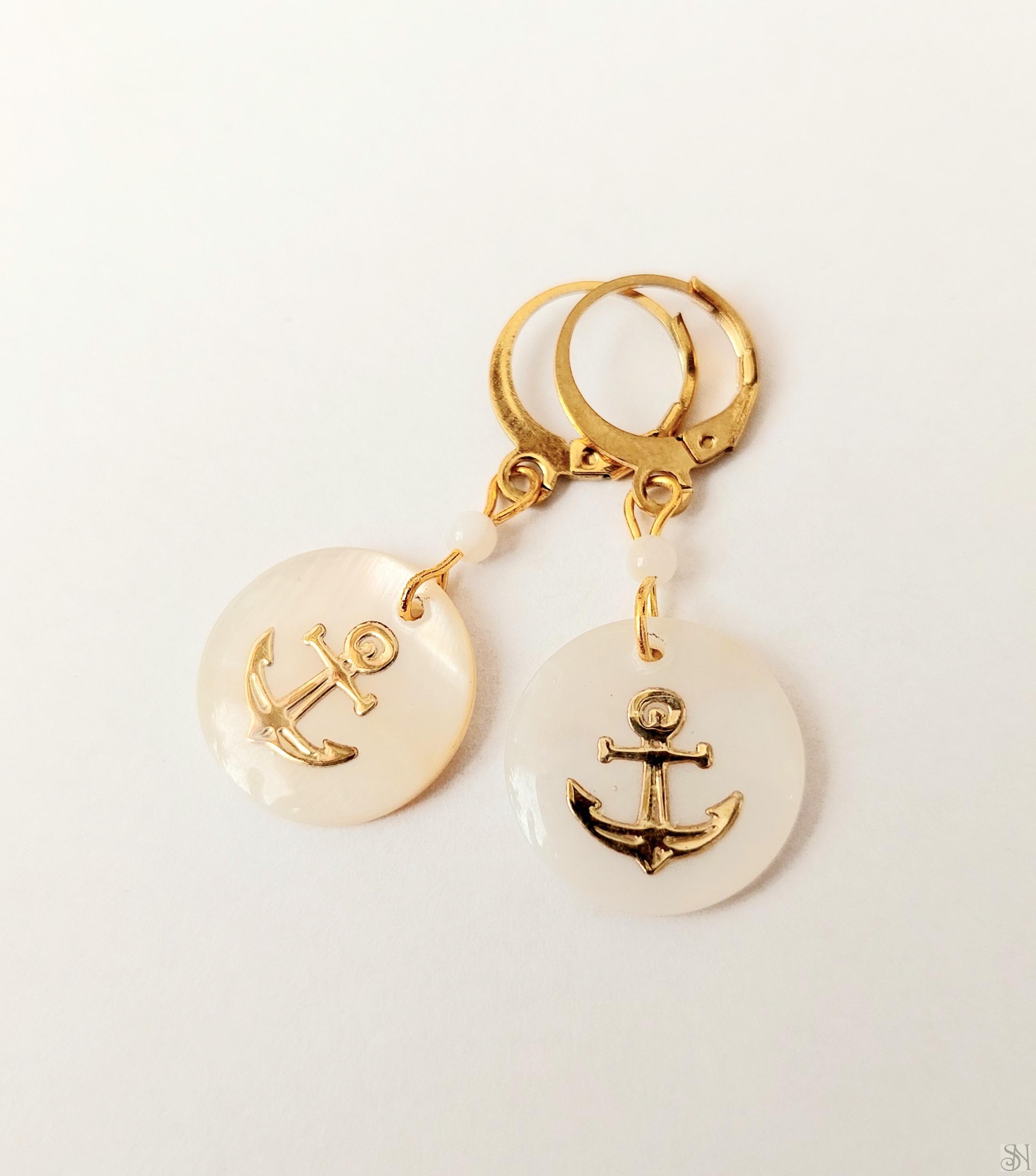 Handmade visiace náušnice z perleťových korálok s motívom kotvy. Náušnice sú doplnené francúzskym zapínaním zlatej farby z chirurgickej ocele.