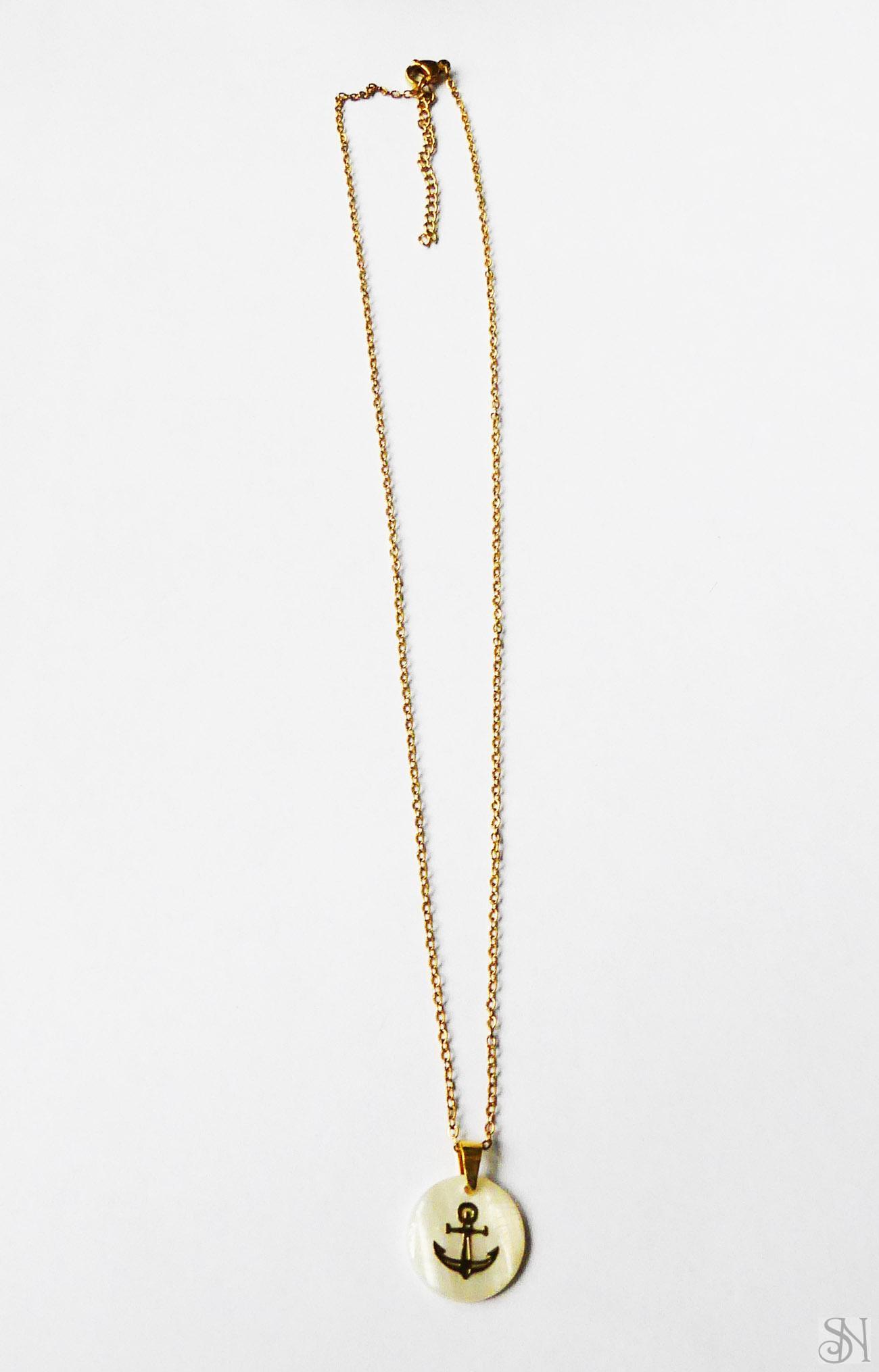 Handmade bielo-zlatý zapínací náhrdelník s perleťovým príveskom. Kovové komponenty sú z chirurgickej ocele v zlatej farbe. Zapínanie je na karabínku.