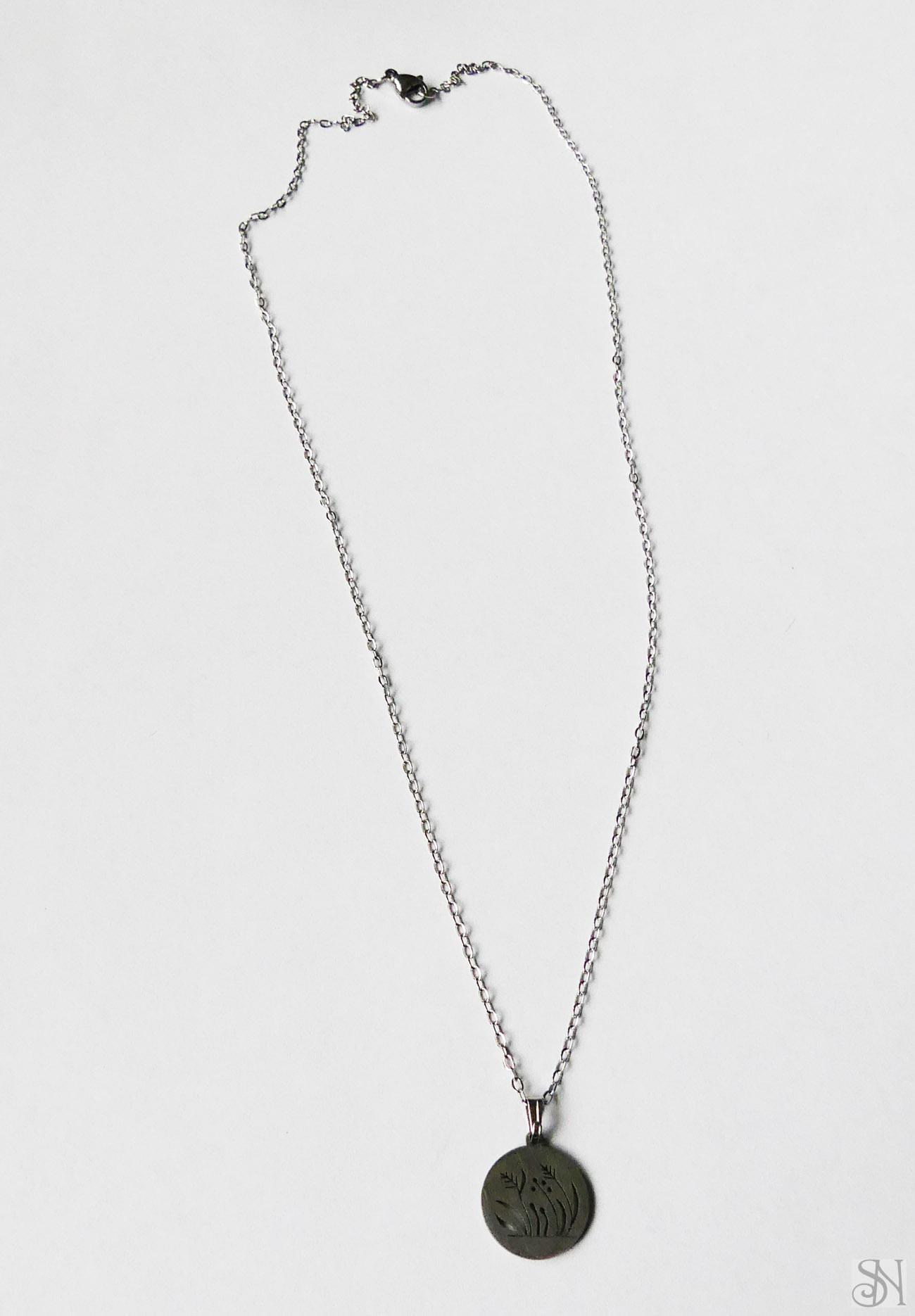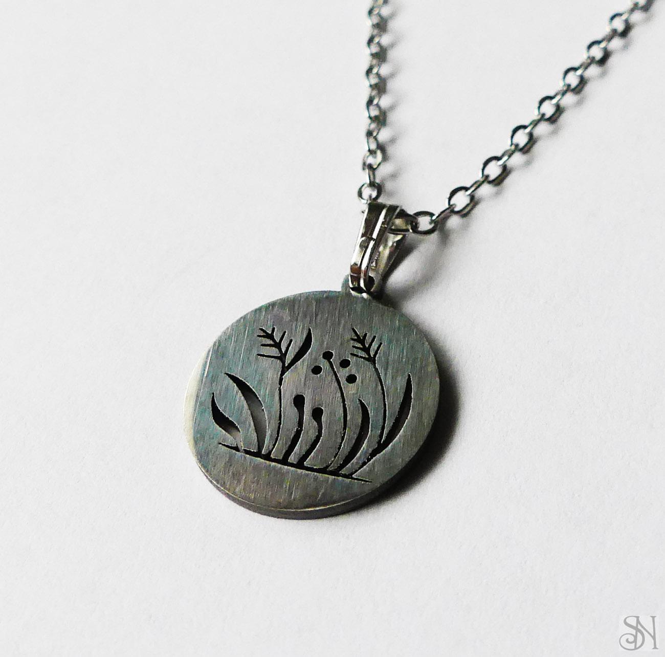 Strieborný zapínací náhrdelník s príveskom v tvare kvetov. Kovové komponenty sú z chirurgickej ocele v striebornej farbe. Zapínanie je na karabínku.