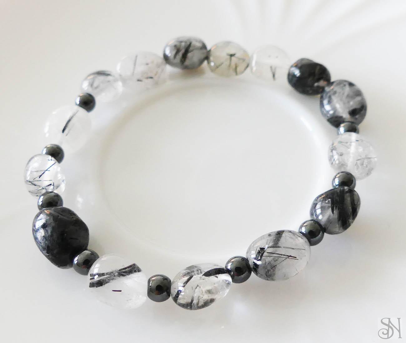 Handmade náramok na gumičke s korálkami z liečivého kameňa krištálu s turmalínom a hematitu.