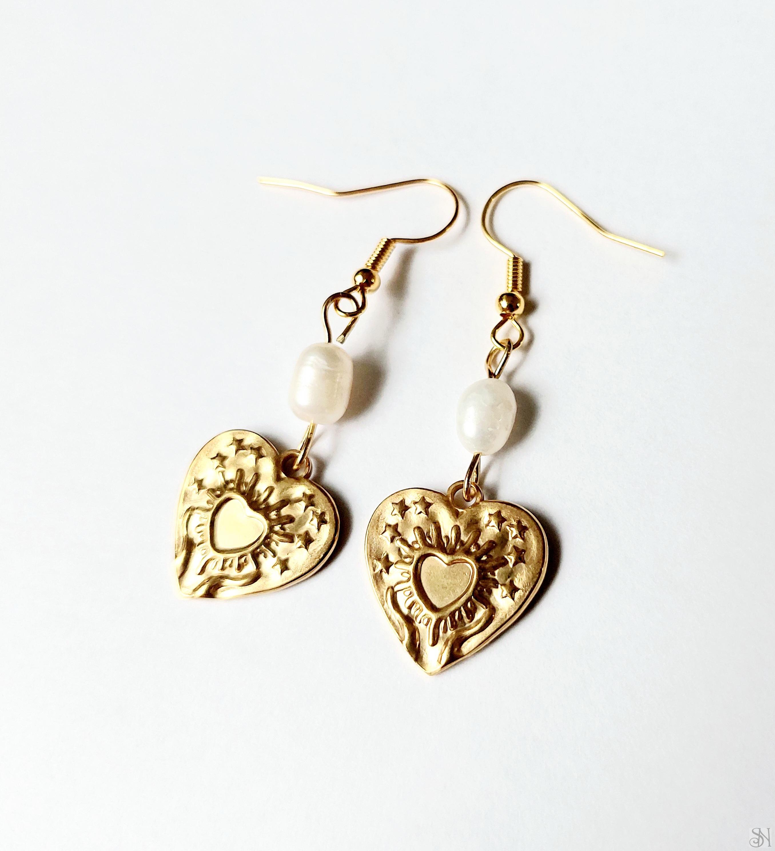 Handmade visiace náušnice v tvare srdiečok z riečnych perál. Náušnice sú doplnené kovovými komponentami zlatej farby z chirurgickej ocele.