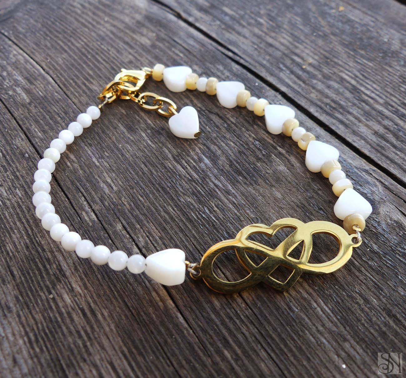 Jemný biely náramok z perleťových korálok. Doplnený je komponentami z chirurgickej ocele. Zapínanie je na karabínku.