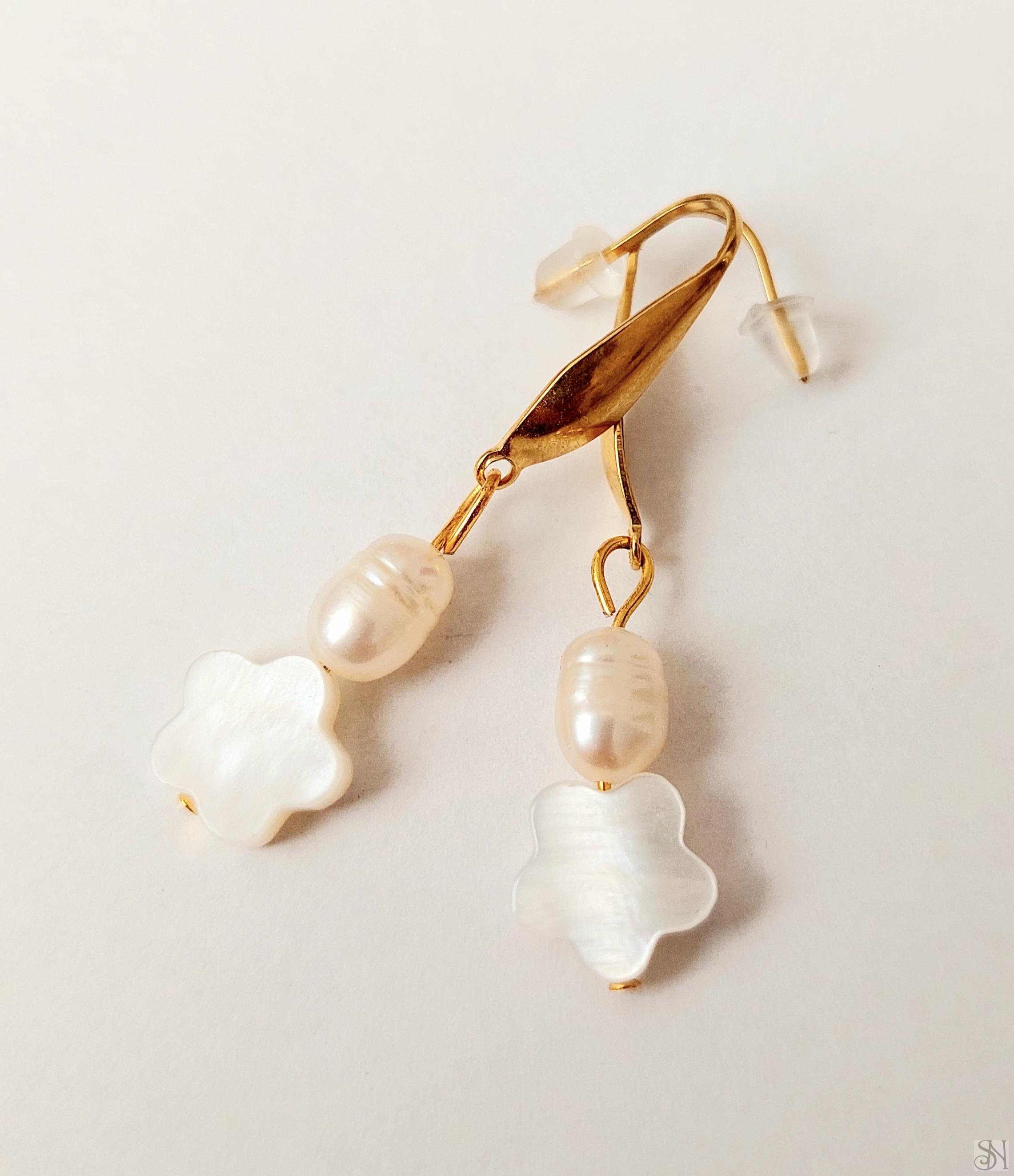 Handmade visiace náušnice z liečivého minerálu riečnej perly a perlete. Náušnice sú doplnené háčikmi zlatej farby z chirurgickej ocele.