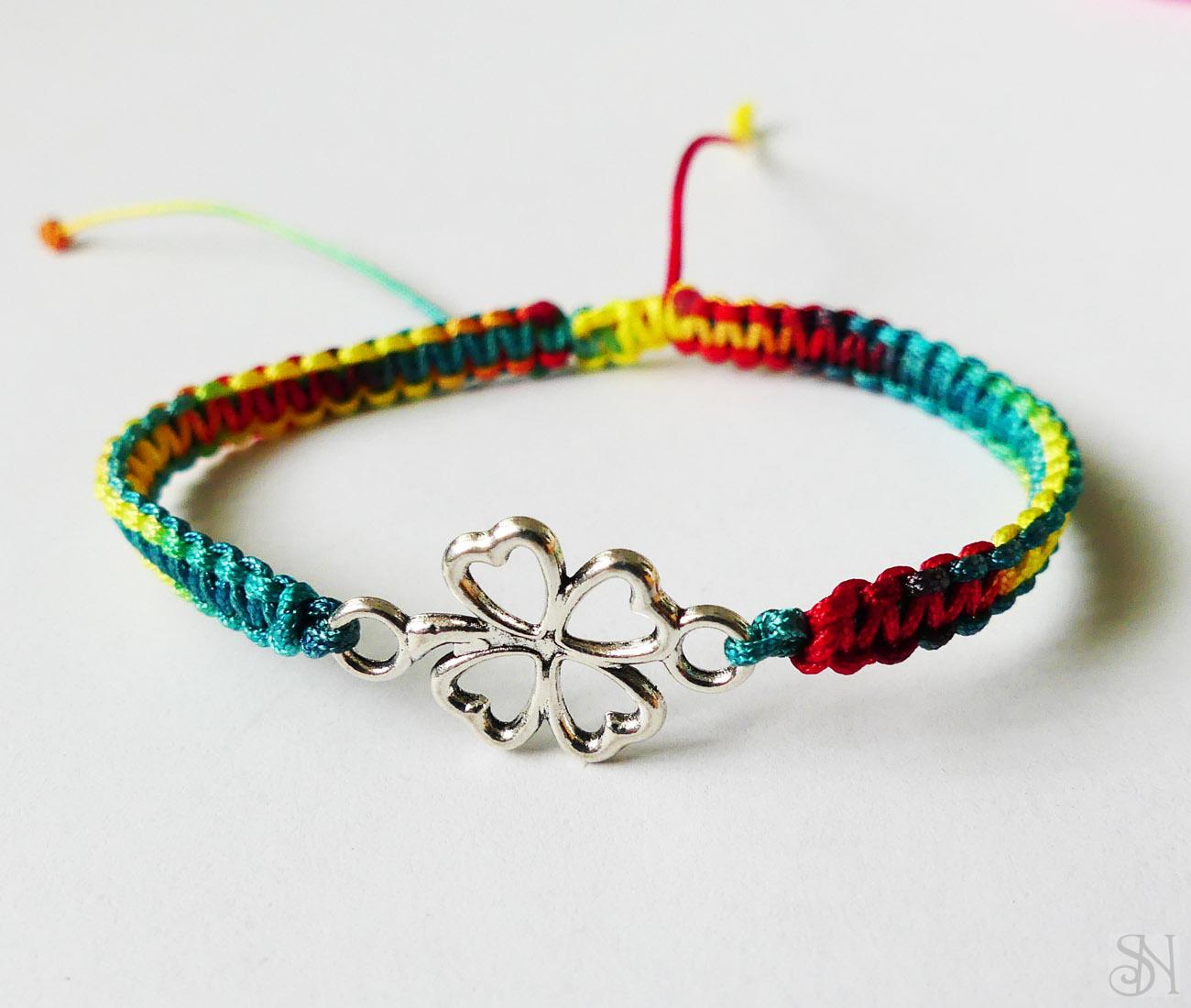 Dúhový náramok vyrobený zo šnúrky s kovovým príveskom bez obsahu niklu. Praktické posuvné makramé zapínanie - náramok sa roztiahne a stiahne podľa potreby.