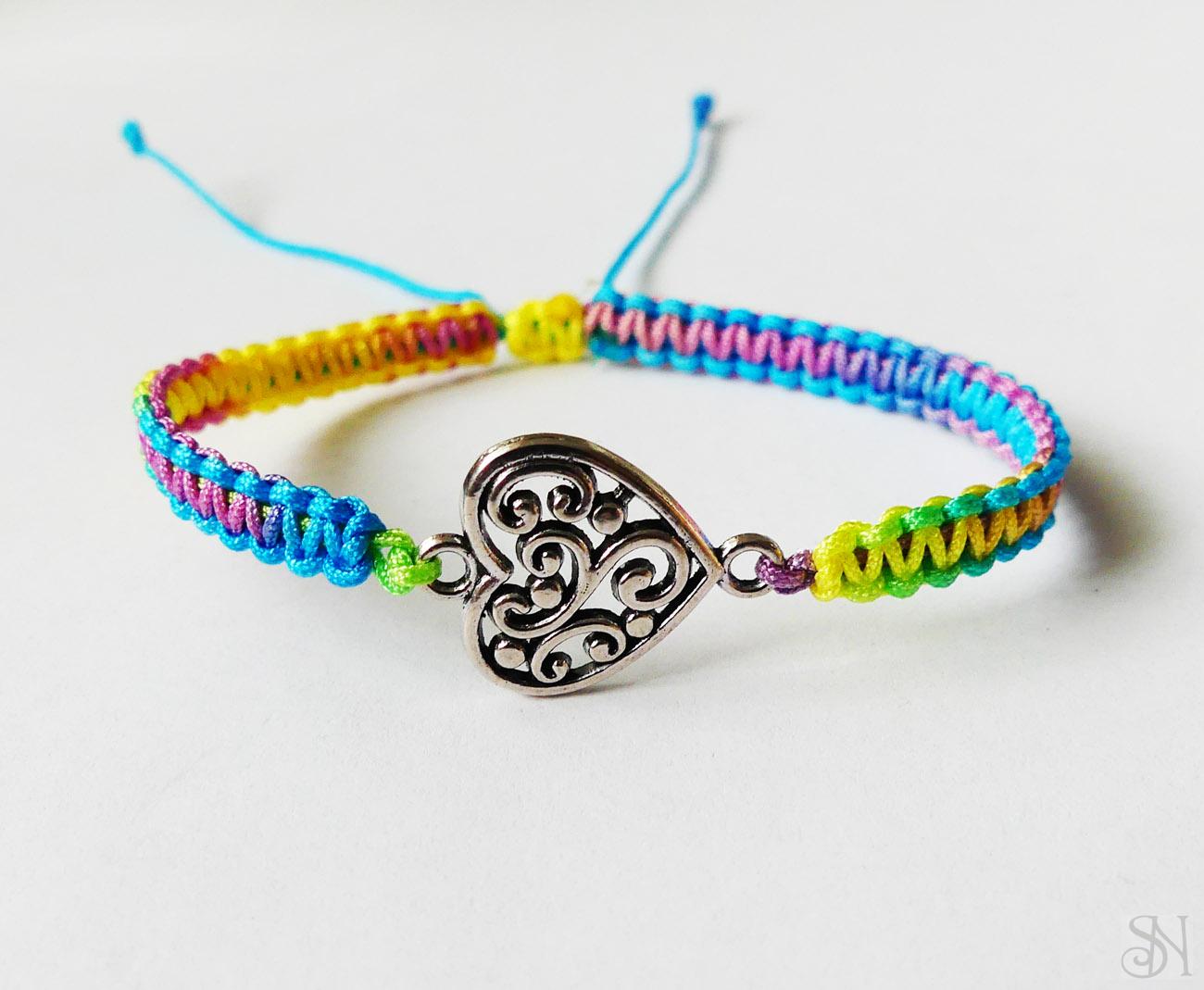Dúhový náramok vyrobený zo šnúrky s kovovým príveskom bez obsahu niklu. Praktické posuvné makramé zapínanie - náramok sa roztiahne a stiahne podľa potreby.