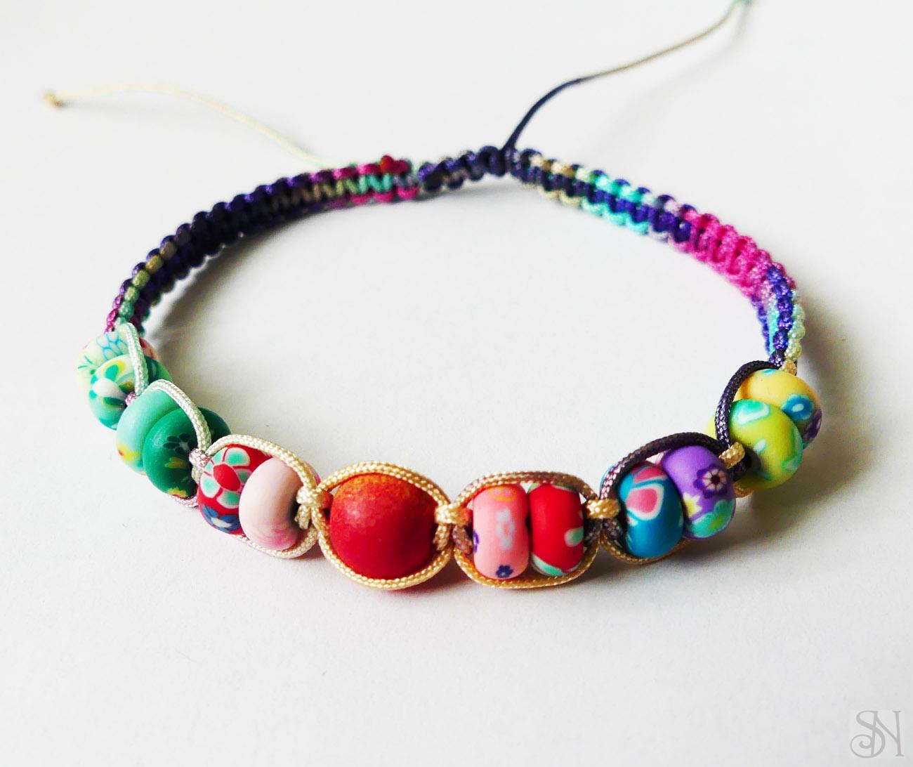 Farebný náramok vyrobený zo šnúrky s korálkami. Praktické posuvné makramé zapínanie - náramok sa roztiahne a stiahne podľa potreby.
