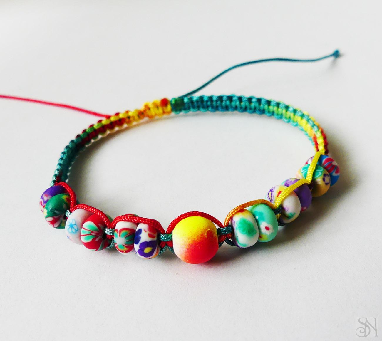 Farebný náramok vyrobený zo šnúrky s korálkami. Praktické posuvné makramé zapínanie - náramok sa roztiahne a stiahne podľa potreby.