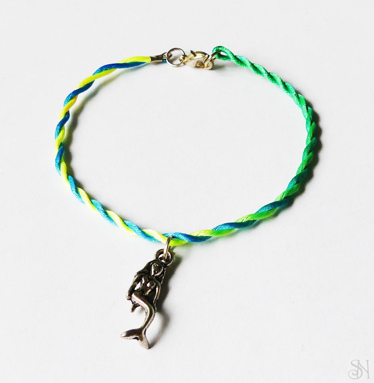 Farebný náramok s príveskom morskej panny. Náramok je vyrobený zo saténovej šnúrky. Doplnený je postriebrenými kovovými komponentami bez obsahu niklu.