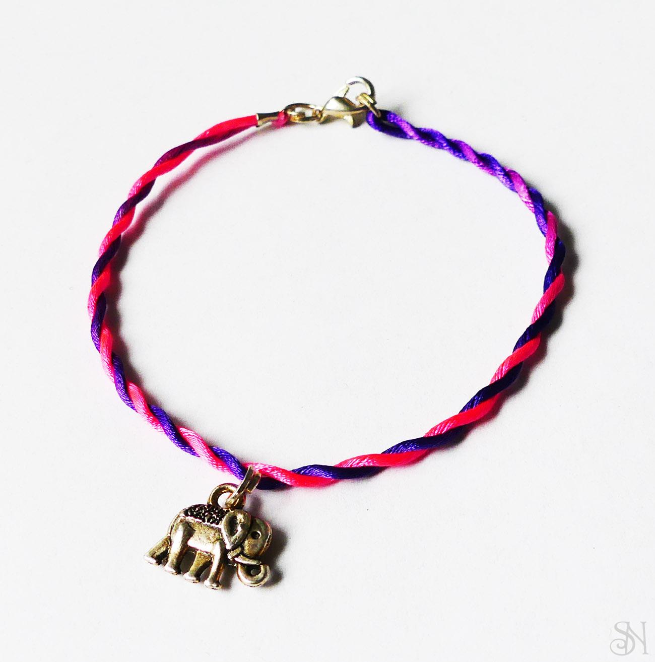 Farebný náramok s príveskom slona. Náramok je vyrobený zo saténovej šnúrky. Doplnený je postriebrenými kovovými komponentami bez obsahu niklu.