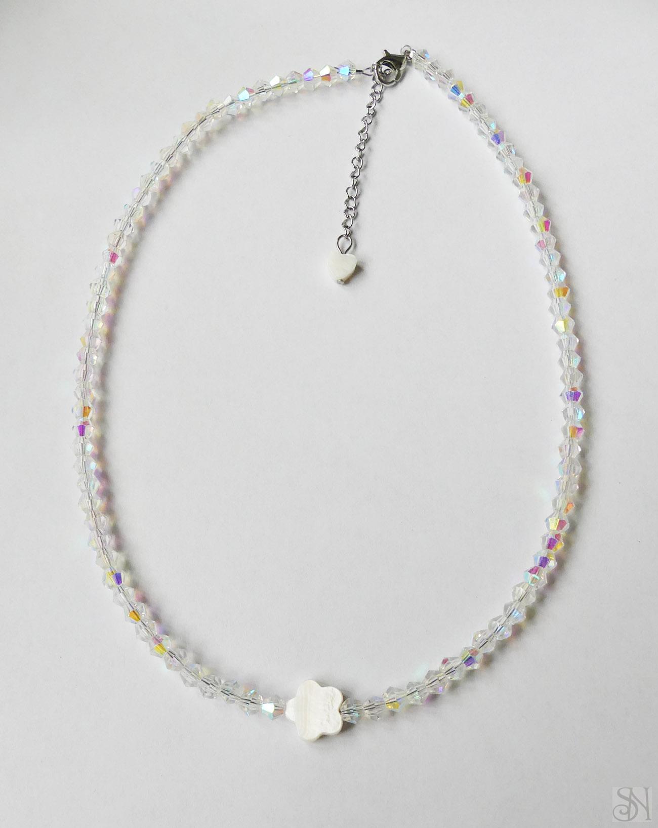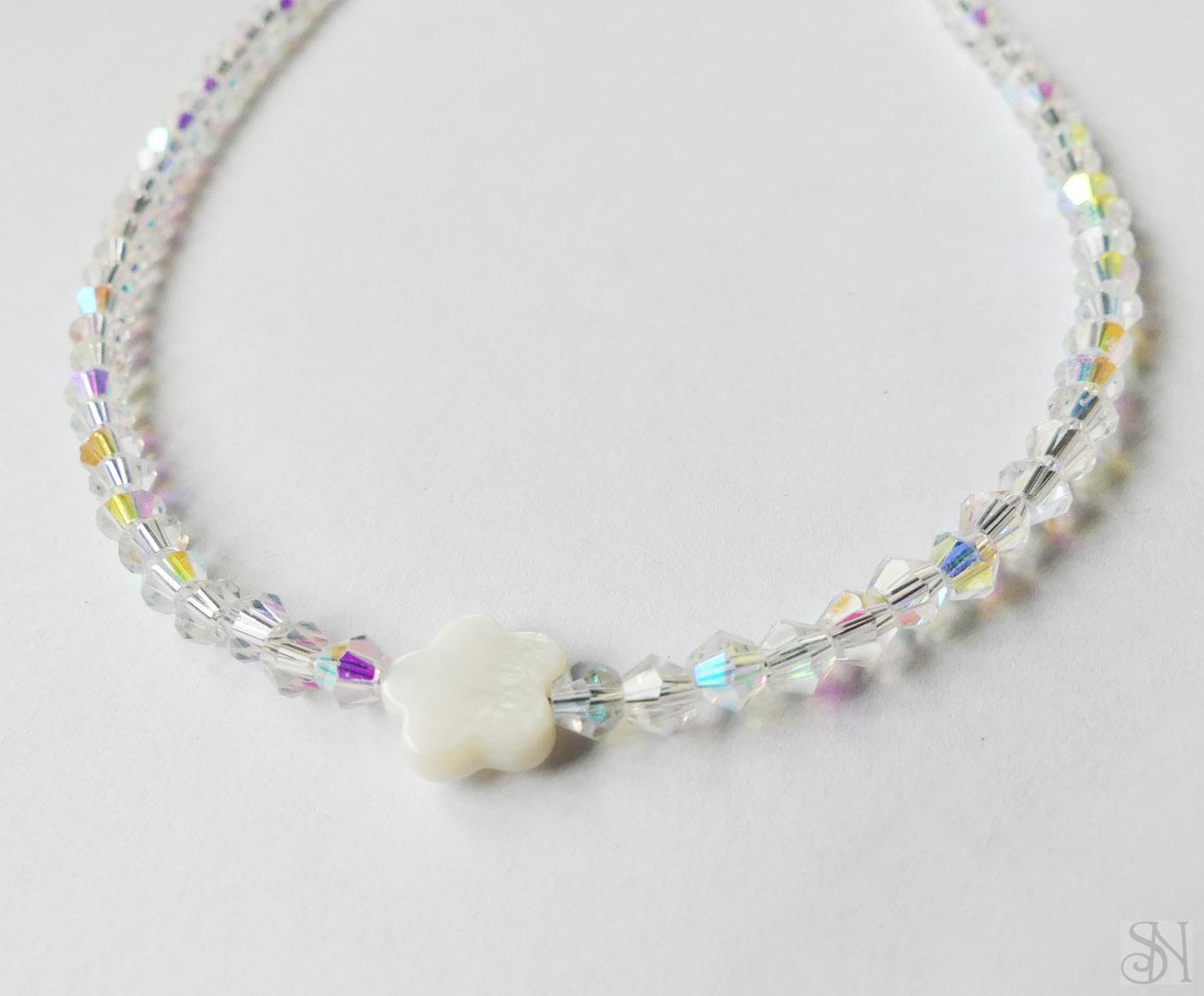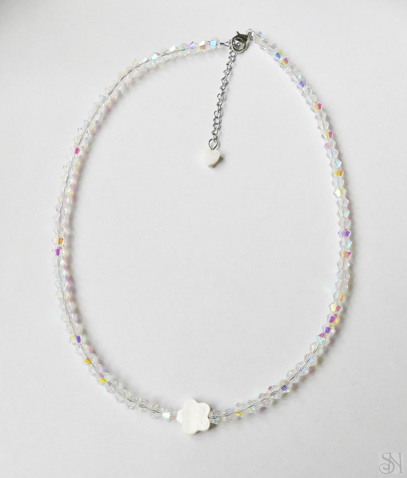 Handmade zapínací náhrdelník s perleťovým kvetom. Kvalitné sklenené korálky sú navliekané na oceľovom lanku. Kovové komponenty sú z chirurgickej ocele striebornej farby. Zapínanie je na karabínku.
